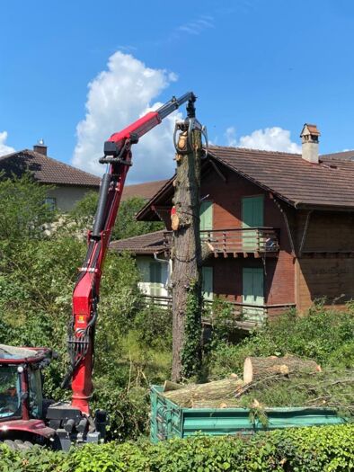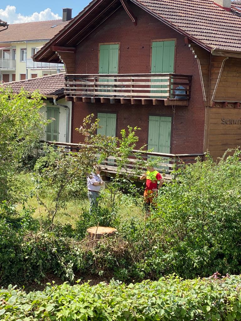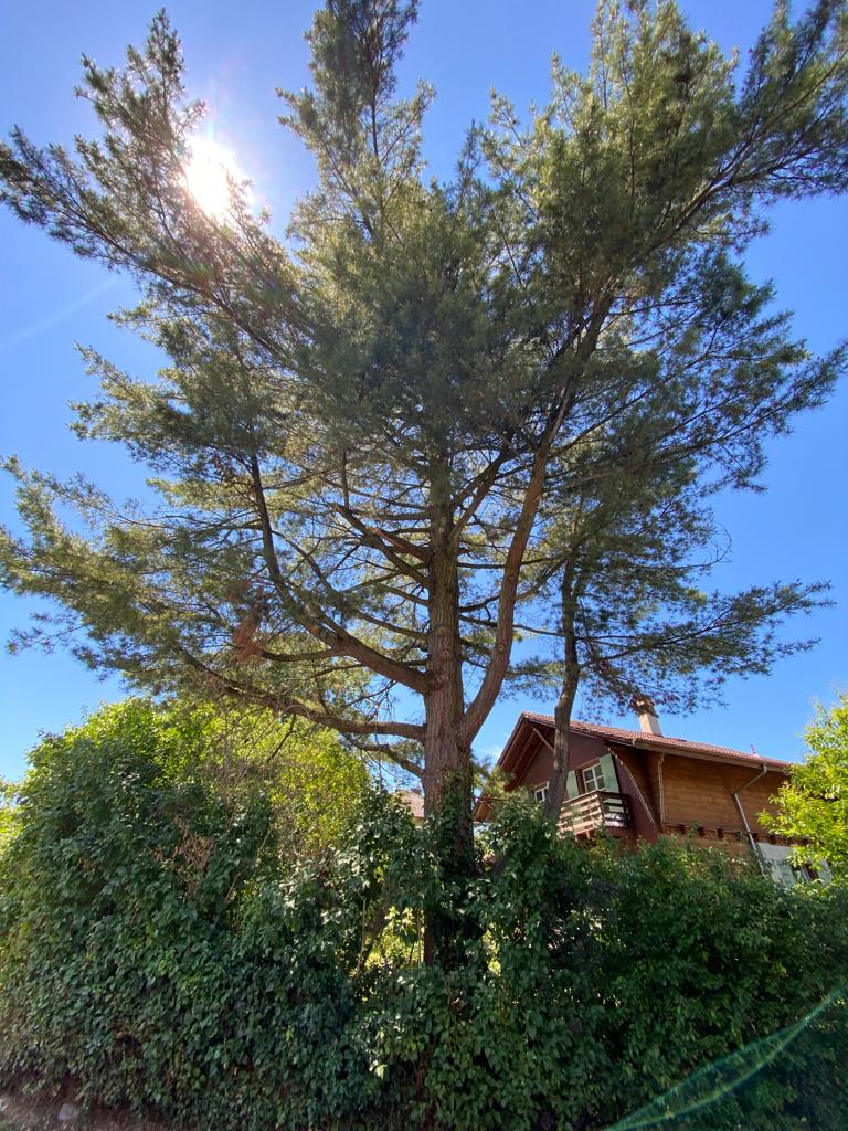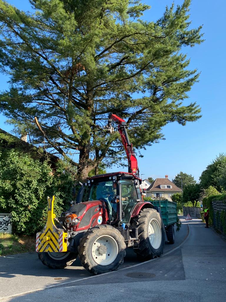 Während eines Sturms im März 2022 mochte ein mächtiger Ast einer Windböe nicht mehr standhalten und brach. Zum Glück kam niemand zu Schaden! Die Besitzer des Baums, Silvia und Alain Grandjean, liessen daraufhin die Föhre prüfen, leider musste das Sicherheitsrisiko als zu hoch eingeschätzt werden, das Schicksal des Baums war besiegelt.