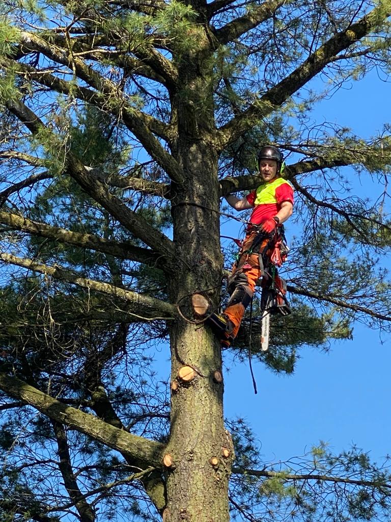Forstwart Adriana Crivellari, der Kletterer, wärmte sich vor der Arbeit mit ein paar Dehnübungen auf. Er meinte, dass der Zeitpunkt für die Fällung insofern günstig sei, da die ersten Vogelbruten ziemlich sicher flügge seien. Er beobachte in seiner Arbeit, dass die Föhren stark unter dem Klimawandel, Stress und auch Pilzbefall leiden, auch bei diesem Baum hier sei die Krone ausgedünnt und die Äste brüchig. Dass das Holz der Föhre als Wärmelieferant in der Heizzentrale Murtens genutzt werden wird, mag ein kleines 'Trösterli' sein.
