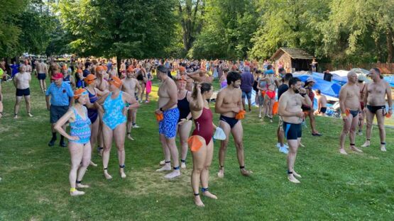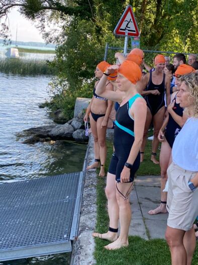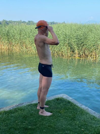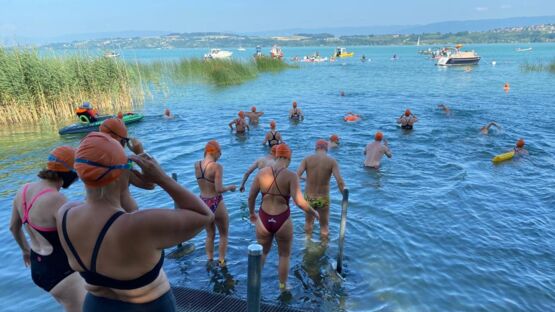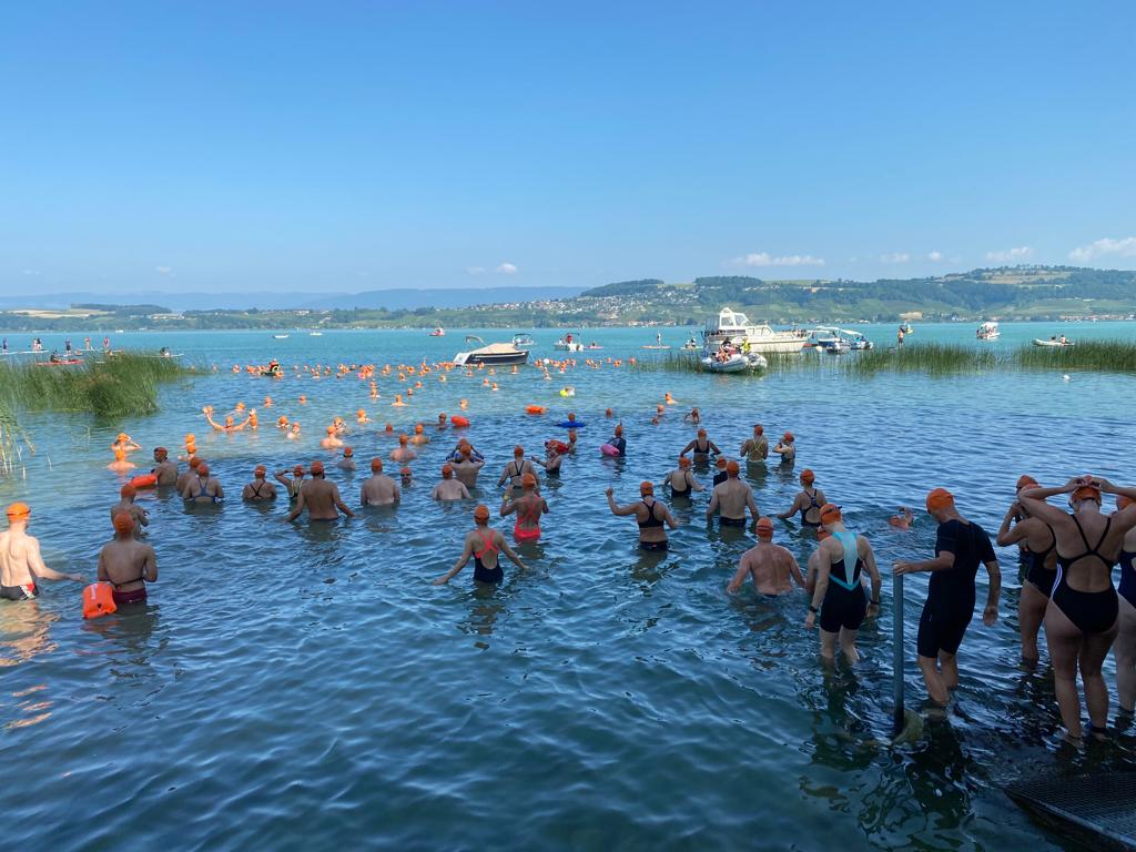 Die 3 Kilometer vom Badeplatz in Meyriez hinüber nach Môtier sind auch für Hobbyschwimmer*innen machbar. Nebst den ambitionierten, gut trainierten Sportler*innen, die die Überquerung in rund dreissig Minuten schaffen, waren entsprechend auch einige Breitensportler*innen dabei. So zum Beispiel Marco Calcano aus Neuchâtel, der durch seine Freundin animiert wurde und zum ersten Mal teilnahm. "Die 7 Kilometer für die Überquerung meines Haus-Sees wären mir definitiv zu lang", scherzte er kurz vor dem Start. "Den Murtensee sollte ich schaffen, hoffentlich in unter sechzig Minuten", so seine persönliche Zielvorgabe. Und los ging es mit dem Sprung ins erfrischende Nass…