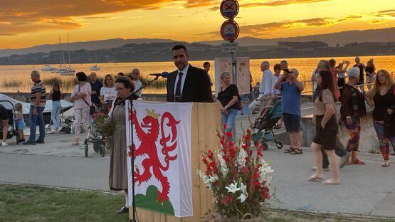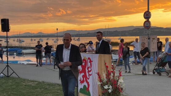 Dann übergab Herren das Wort an Christoph Wieland. Dieser sagte, teilweise in Deutsch und teilweise in Französisch, jede*r Einzelne solle sich an diesem Tag auf das besinnen, was uns alle verbindet: Schweizer zu sein.