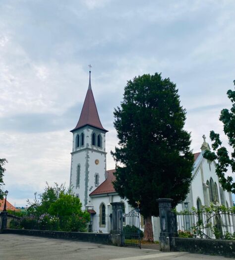 Auch, wenn man schon länger vor Ort lebt – wie ich – kann man noch einiges an Neuem erfahren. Beispielsweise, wie schön es ist, wenn die Sonne abends die Farben der Fenster der katholischen Kirche einfängt und ihre Reflexion auf der Erde sichtbar wird.