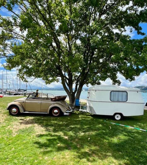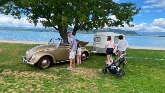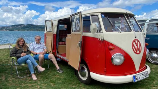 Zu diesen VW-Oldtimer-Liebhaber*innen zählen auch Viola Meisterling und Jürgen Brunni aus Deutschland. Sie sind mit ihrem T1 VW-Bus – einem ehemaligen Feuerwehrbus – von Grossgeraus in der Nähe von Frankfurt nur für dieses Treffen in die Schweiz gefahren. «Fünf Stunden auf der Autobahn mit Tempo 90 – sehr zum Leidwesen der anderen Autofahrer», fügen sie schmunzelnd hinzu. Sie waren schon vor vier Jahren dabei und sind wiedergekommen, weil ihnen am Treffen hier speziell gefällt, dass nur Oldtimer zugelassen sind. «Und natürlich auch, weil Murten so schön ist!»