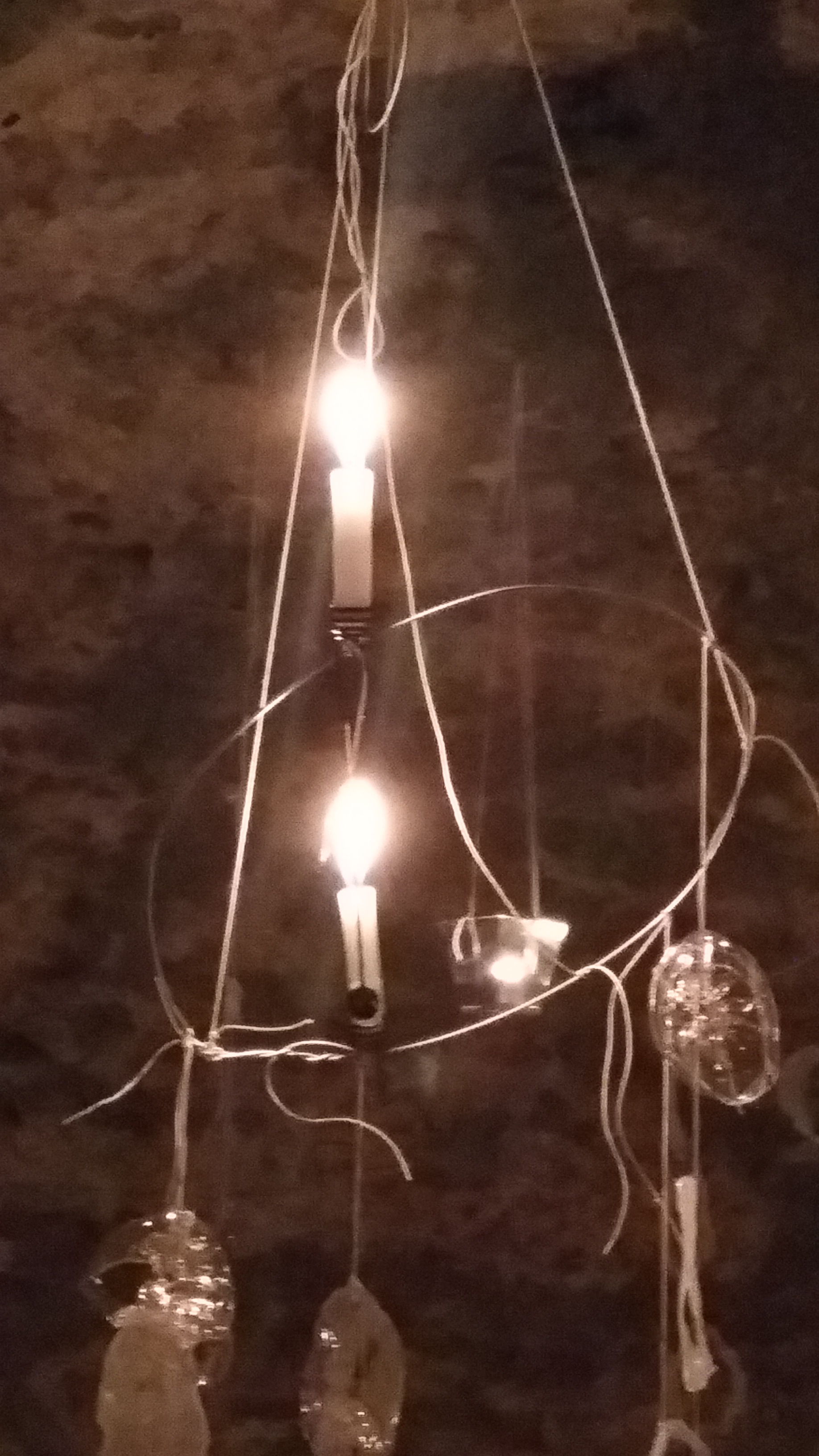 Bereits vor dem Schlosseingang lädt der Kräutergarten, beleuchtet von Kerzen und Fackeln, zum Spaziergang ein. Hinten im Kräutergarten - das Kellergewölbe mutet beinahe eine wenig unheimlich an - lassen mich die von den Münchenwiler Schülern angefertigten kunstvollen Installationen staunen. Es sind Zauber- und Märchenwelten aus Draht, Kerzen, geschmolzenem Plastik (oder getrocknetem Leim) ... egal, der Anblick dieser filigranen Gebilde ist wundervoll!