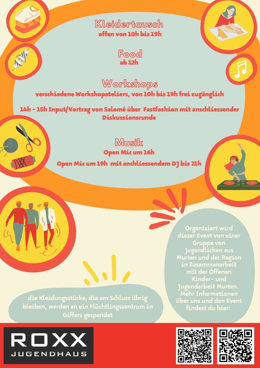 So funktioniert die Kleiderbörse: Bringe mindestens ein «altes» Kleidungsstück mit und suche dir ein anderes aus. In verschiedenen Workshops im ROXX kannst du deinen «neuen» Kleidern ein persönliches Outfit verpassen und nach getaner Arbeit ist auch für das leibliche Wohl gesorgt.