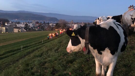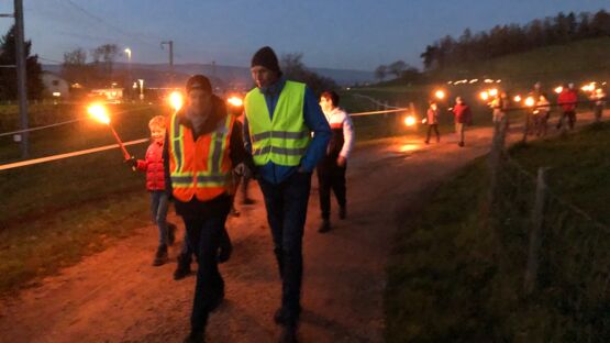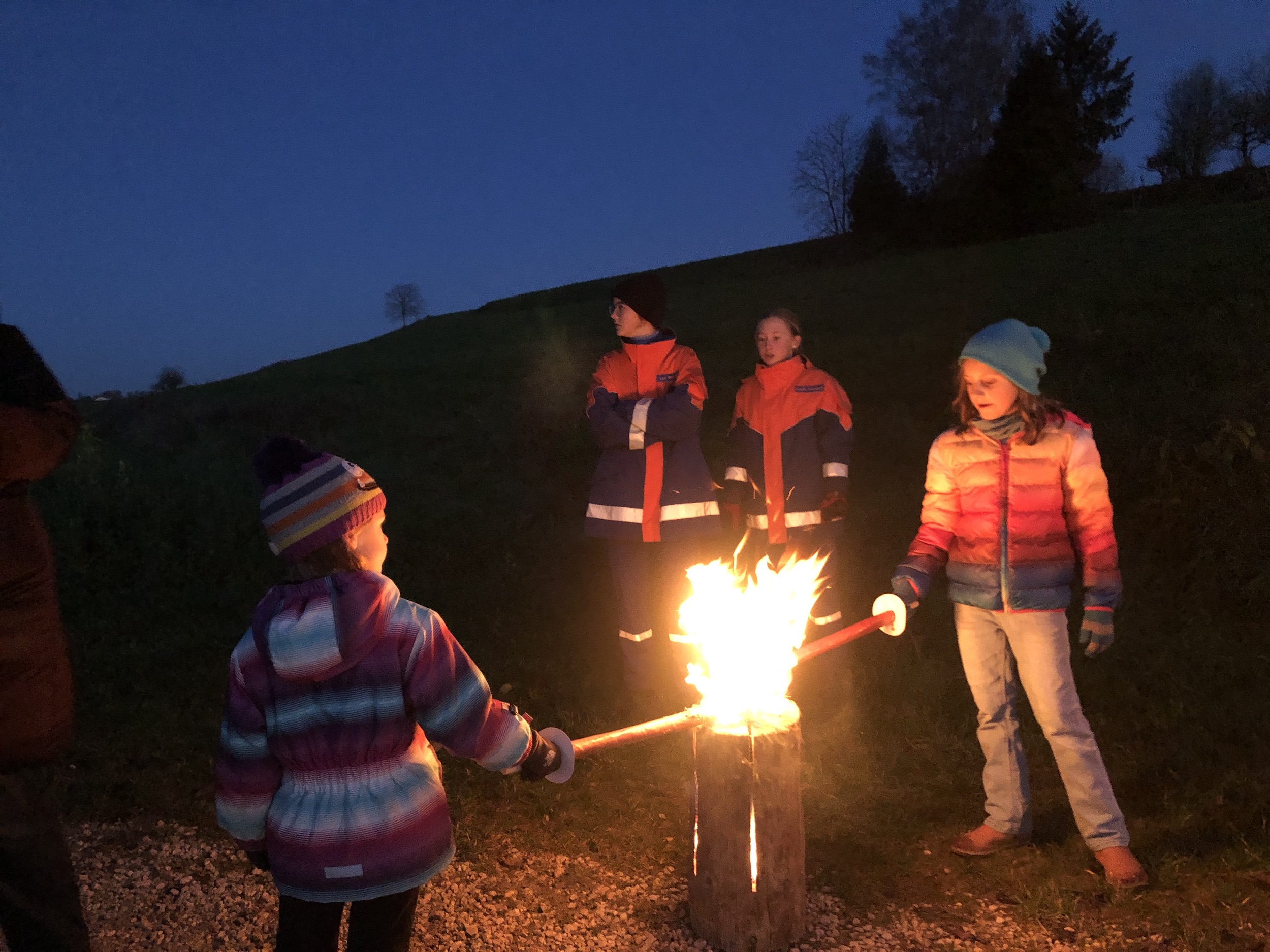 Die Wanderung startet gegen 17 Uhr beim OSRM-Parkplatz. Mit Fackeln und Lampions, gar mit Licht-Festival-Lichterketten und leuchtenden Zauberstäben ausgerüstet, werden die ersten paar hundert Meter bis zum Zigerli noch bei Tageslicht zurückgelegt. Aber dann beginnt es schnell zu dunkeln, und an der ersten Finnenkerze, die die Jugendfeuerwehr bereitgestellt hat, werden endlich die Fackeln angezündet.
