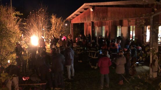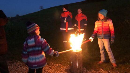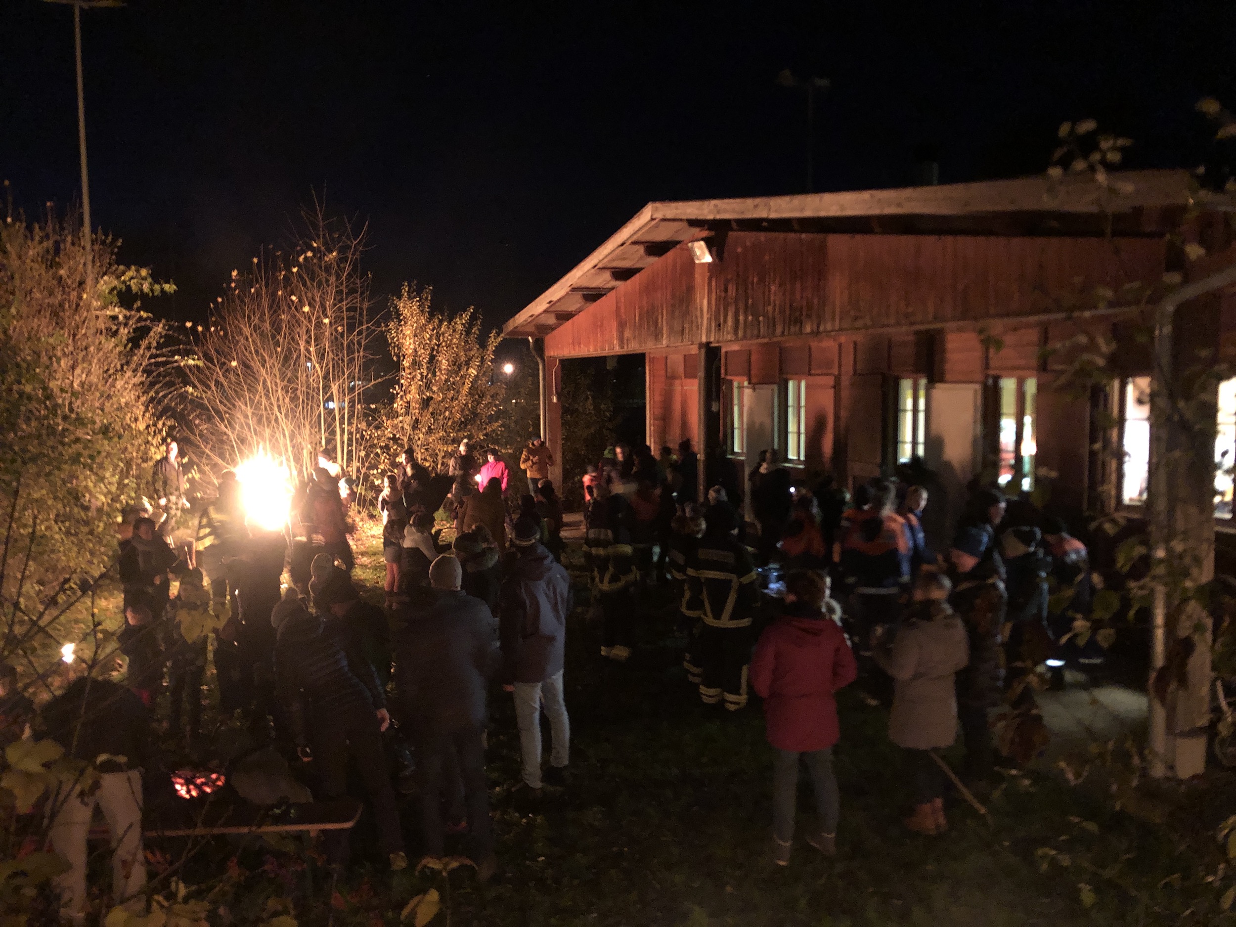 Immer stärker greift die Dunkelheit um sich, während die Gesichter der Kinder im Widerschein der Flammen zu leuchten und strahlen beginnen. Und so wird über Feldwege nach rund einem Kilometer der westlichste Punkt der Wanderung beim Bahnhof Münchenwiler-Courgevaux erreicht. Anschliessend folgt die Wanderung dem plätschernden Prehlbach bis zum Pfadiheim, wo das Ziel auch schon erreicht ist.