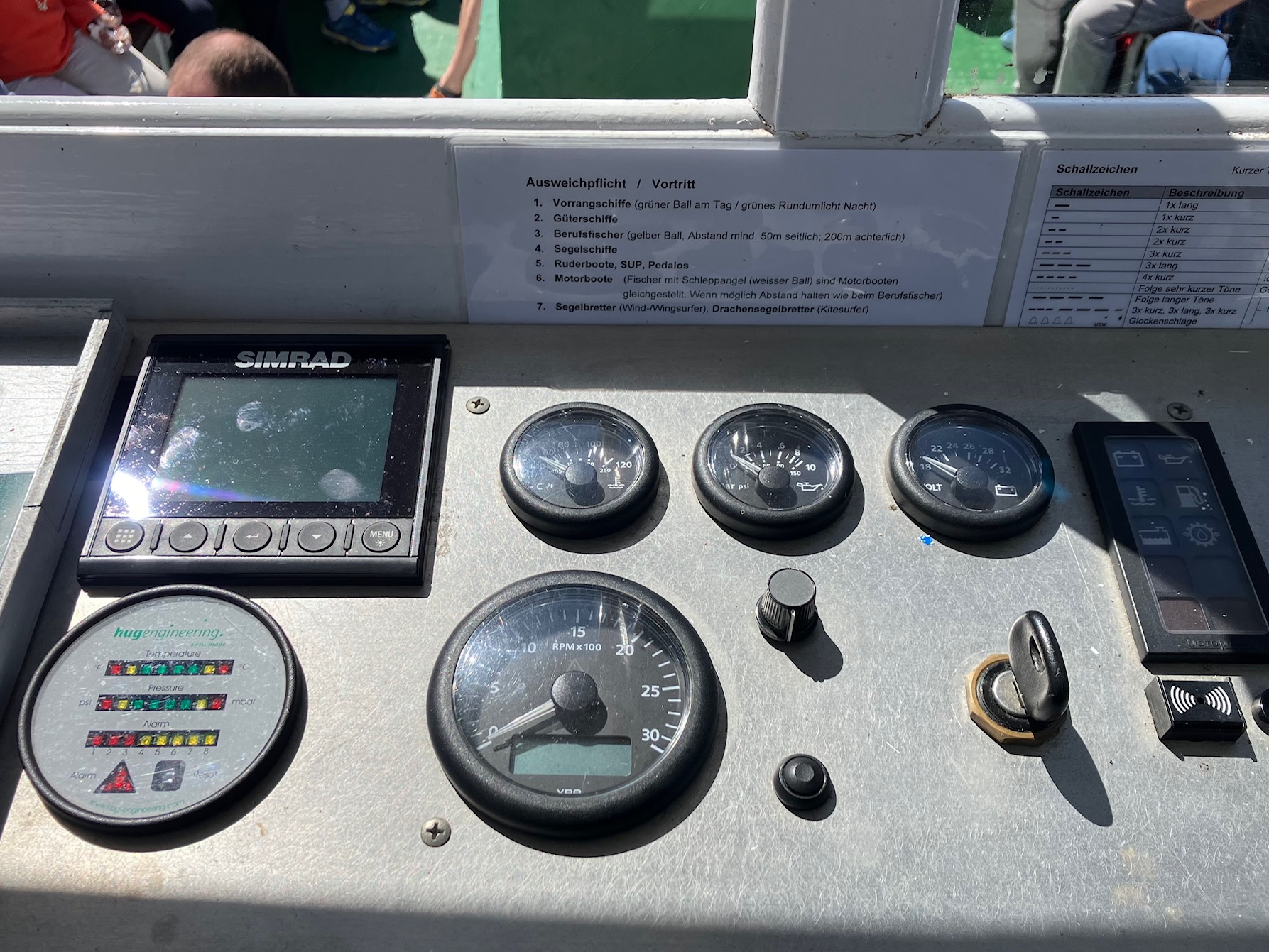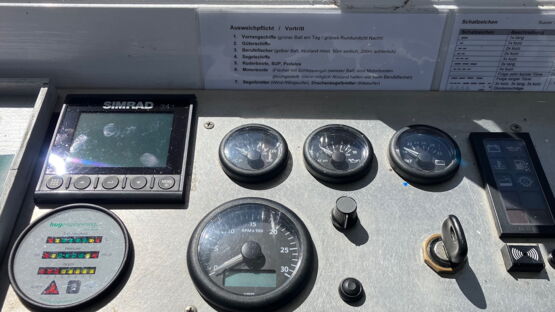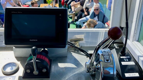So wird unter anderem ein Echolot zur Tiefenmessung eingesetzt: Schallwellen werden ausgesendet, reflektiert und zurück zum Echolot geschickt, um die Wassertiefe zu bestimmen. Dank eines nachträglich eingebauten Radarsystems kann das MS Murten auch bei Nebel sicher manövrieren.