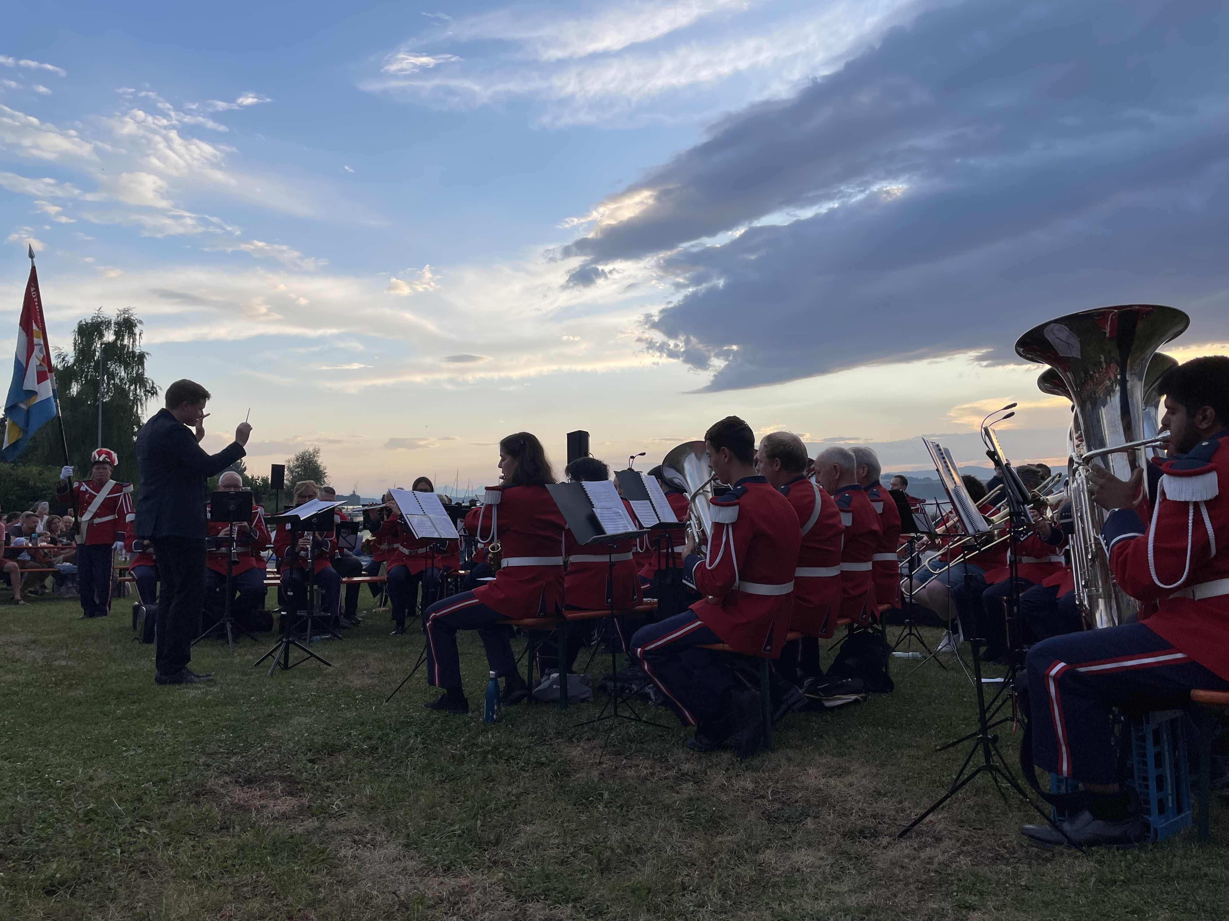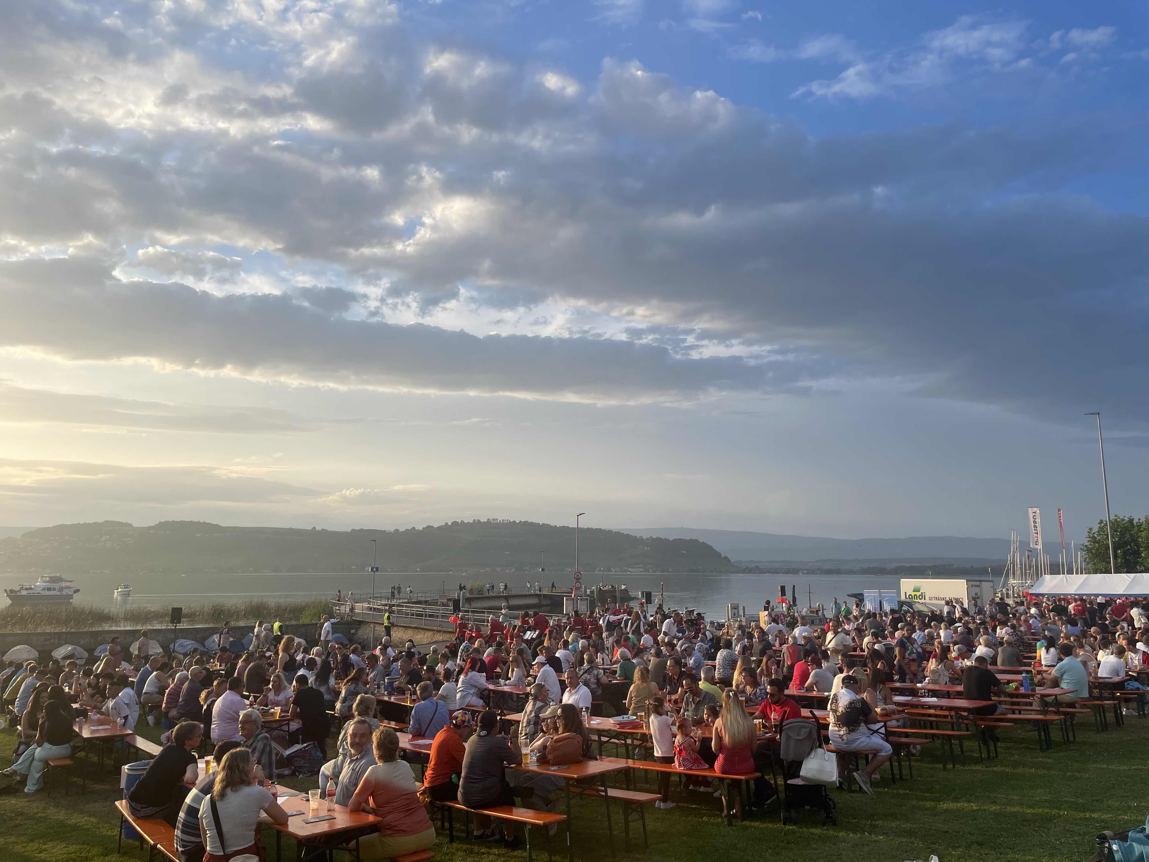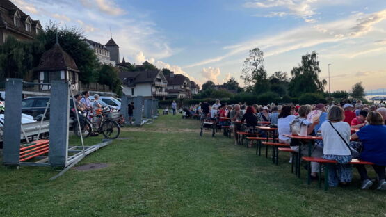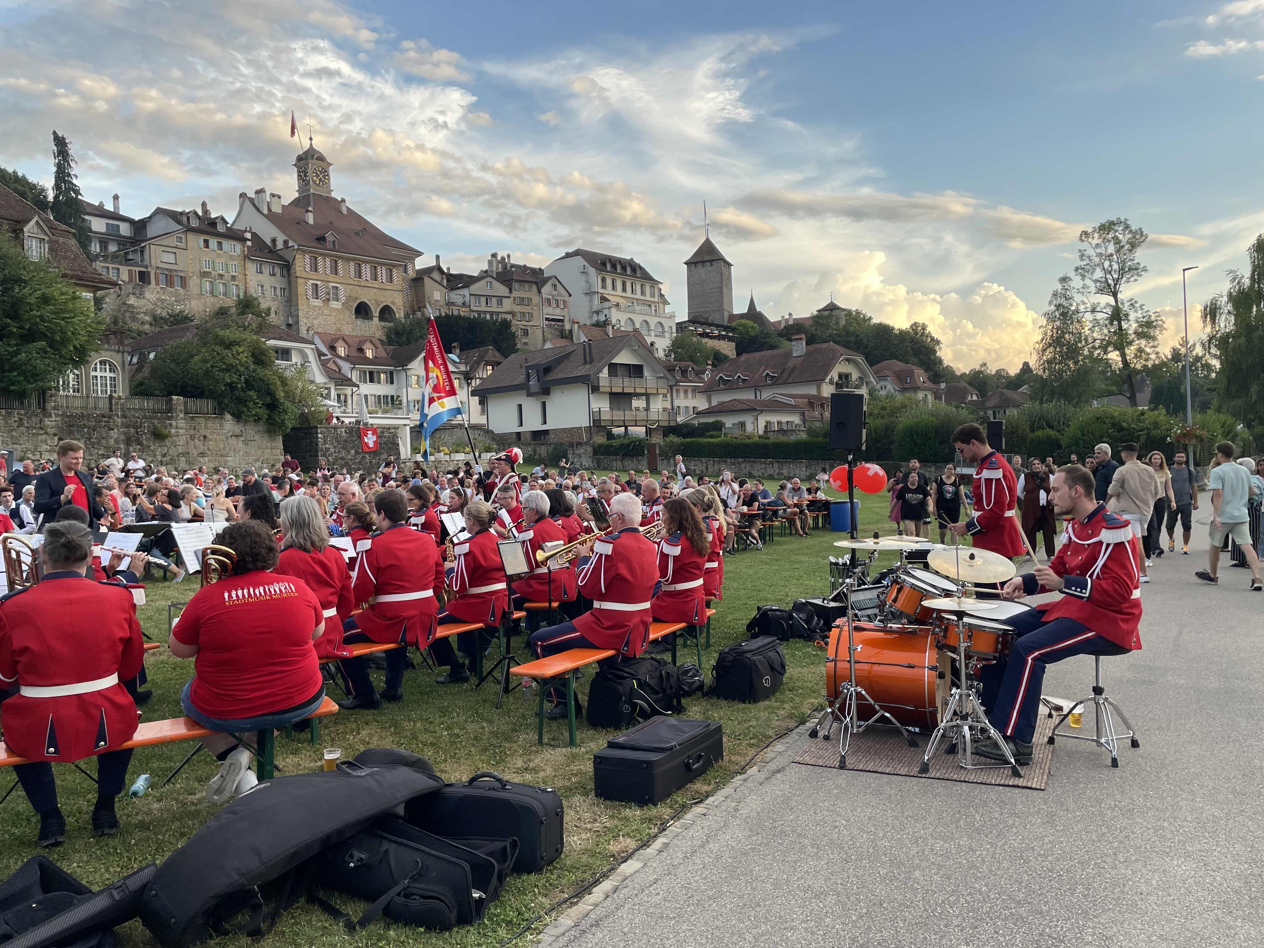 Kurz nach 20.30 Uhr begann die Stadtmusik unter der Leitung von Dirigent Matthias Schwaller mit einem fetzigen Song. Das heiterte die ohnehin gute Stimmung auf der Säulimatte am Murtensee noch weiter auf. Abwechslungsweise spielten die Stadtmusik und die Tambouren ein Stück. Nach einer halben Stunde schritt Gemeinderat Ruedi Herren zum Rednerpult. Auch er bedankte sich bei Petrus: «Es sieht so aus, als ob Petrus Murtner wäre», meinte Herren mit einem Schmunzeln. Er bedankte sich bei den anwesenden Gästen, den Tambouren und der Stadtmusik und übergab das Wort Sophie Hogrefe, der neuen Direktorin der Murten Classics (unsereRegion berichtete). Sie begann ihre Rede auf kreative Art und Weise: «Wissen Sie, was ein Pasticcio ist?», fragte sie zu Beginn das Publikum. Es bedeutet Pastete auf Italienisch. Doch das Wort steht international für eine Oper oder ein musikalisches Werk, das aus bereits existierender Musik zusammengestellt ist. Ähnlich wie eine Pastete, die aus verschiedensten Zutaten gefertigt wird. Und nur, wenn man hochwertige Zutaten verwendet, ergäbe sich daraus etwas Schönes. Und so sei auch die Schweiz: Eine Mischung aus verschiedenen Sprachen, Kulturen und Herkünften. Zum Schluss ihrer Rede fragte Hogrefe, wo es denn in Murten die beste Pastete gibt. Sie hoffe auf Vorschläge von den Gästen.