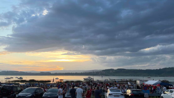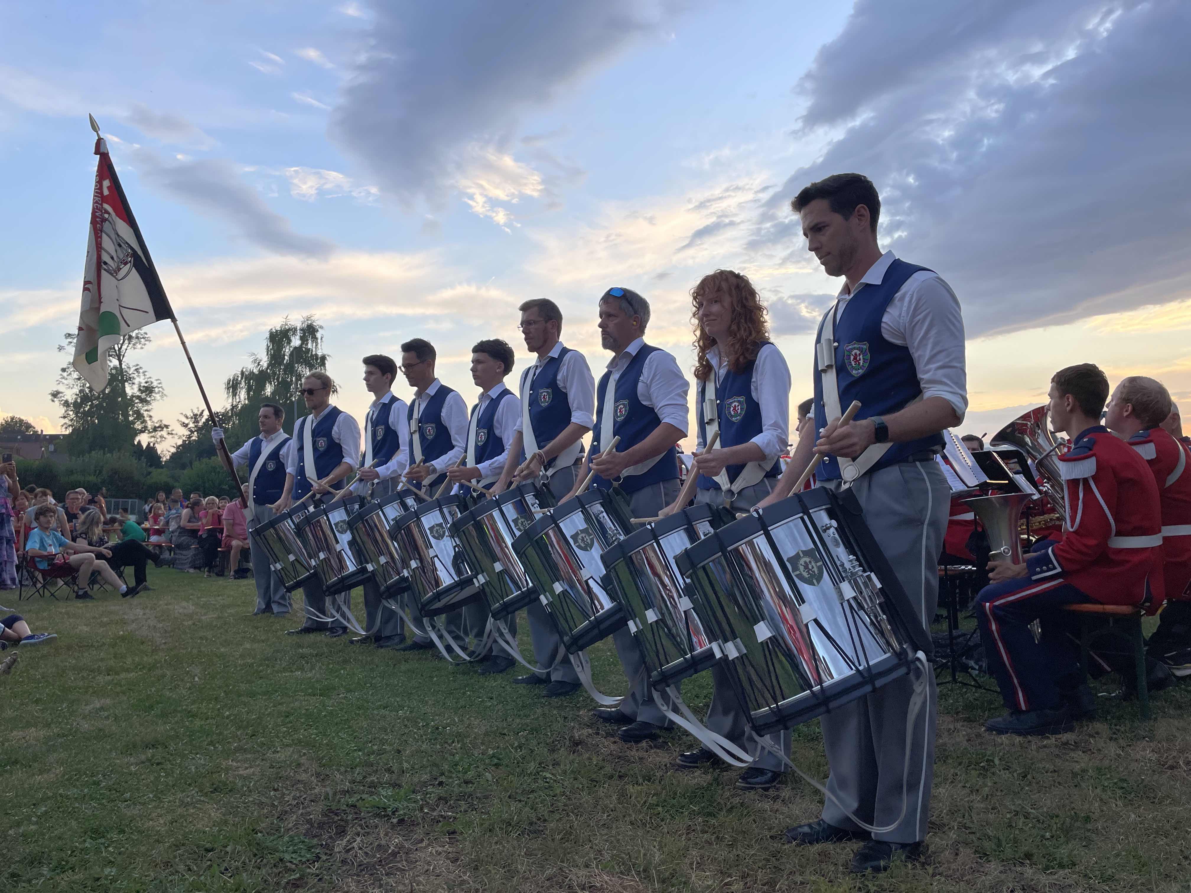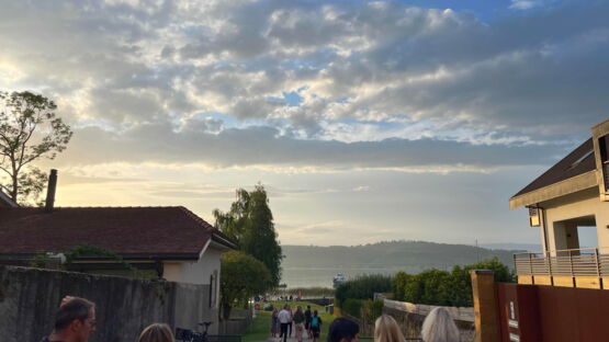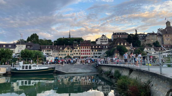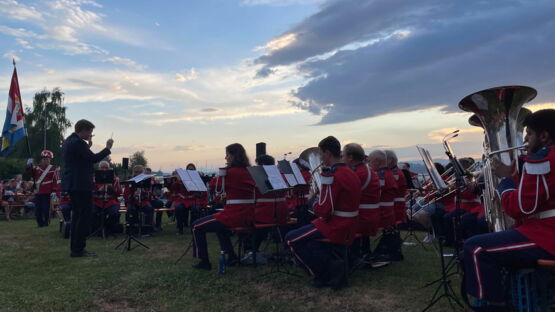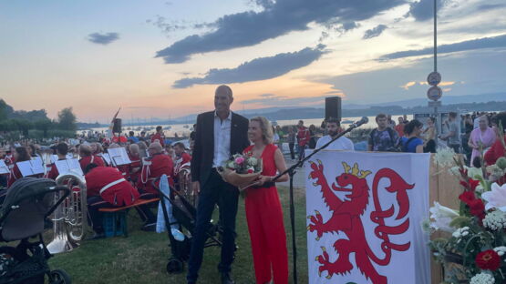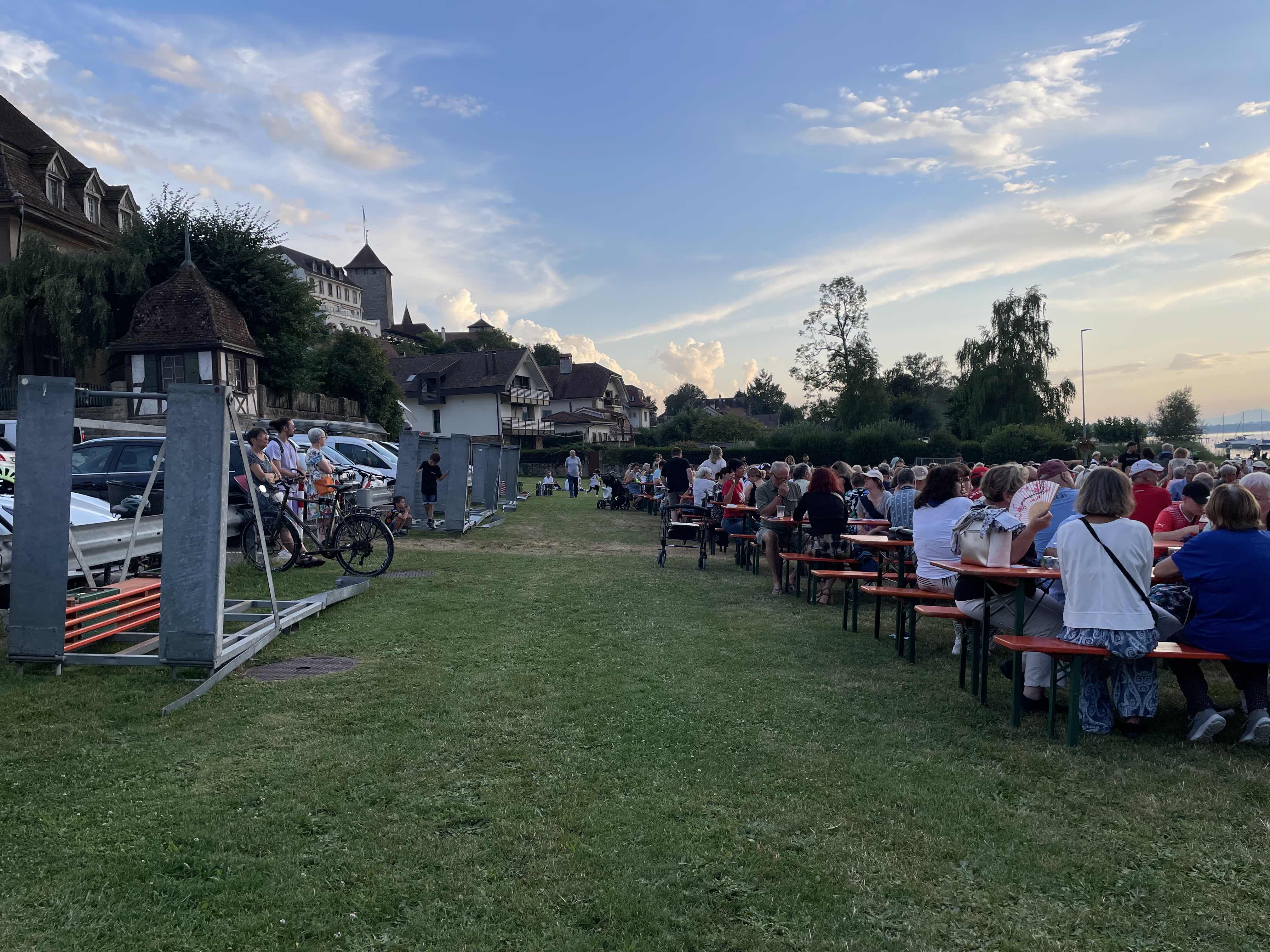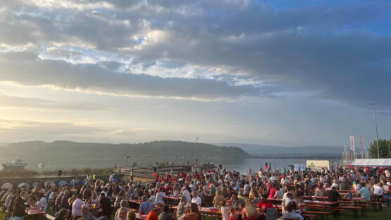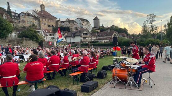 Kurz nach 20.30 Uhr begann die Stadtmusik unter der Leitung von Dirigent Matthias Schwaller mit einem fetzigen Song. Das heiterte die ohnehin gute Stimmung auf der Säulimatte am Murtensee noch weiter auf. Abwechslungsweise spielten die Stadtmusik und die Tambouren ein Stück. Nach einer halben Stunde schritt Gemeinderat Ruedi Herren zum Rednerpult. Auch er bedankte sich bei Petrus: «Es sieht so aus, als ob Petrus Murtner wäre», meinte Herren mit einem Schmunzeln. Er bedankte sich bei den anwesenden Gästen, den Tambouren und der Stadtmusik und übergab das Wort Sophie Hogrefe, der neuen Direktorin der Murten Classics (unsereRegion berichtete). Sie begann ihre Rede auf kreative Art und Weise: «Wissen Sie, was ein Pasticcio ist?», fragte sie zu Beginn das Publikum. Es bedeutet Pastete auf Italienisch. Doch das Wort steht international für eine Oper oder ein musikalisches Werk, das aus bereits existierender Musik zusammengestellt ist. Ähnlich wie eine Pastete, die aus verschiedensten Zutaten gefertigt wird. Und nur, wenn man hochwertige Zutaten verwendet, ergäbe sich daraus etwas Schönes. Und so sei auch die Schweiz: Eine Mischung aus verschiedenen Sprachen, Kulturen und Herkünften. Zum Schluss ihrer Rede fragte Hogrefe, wo es denn in Murten die beste Pastete gibt. Sie hoffe auf Vorschläge von den Gästen.