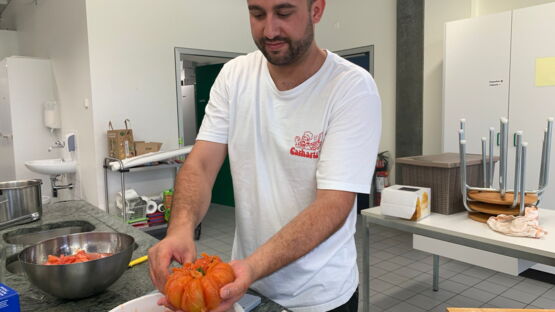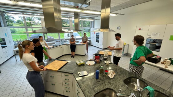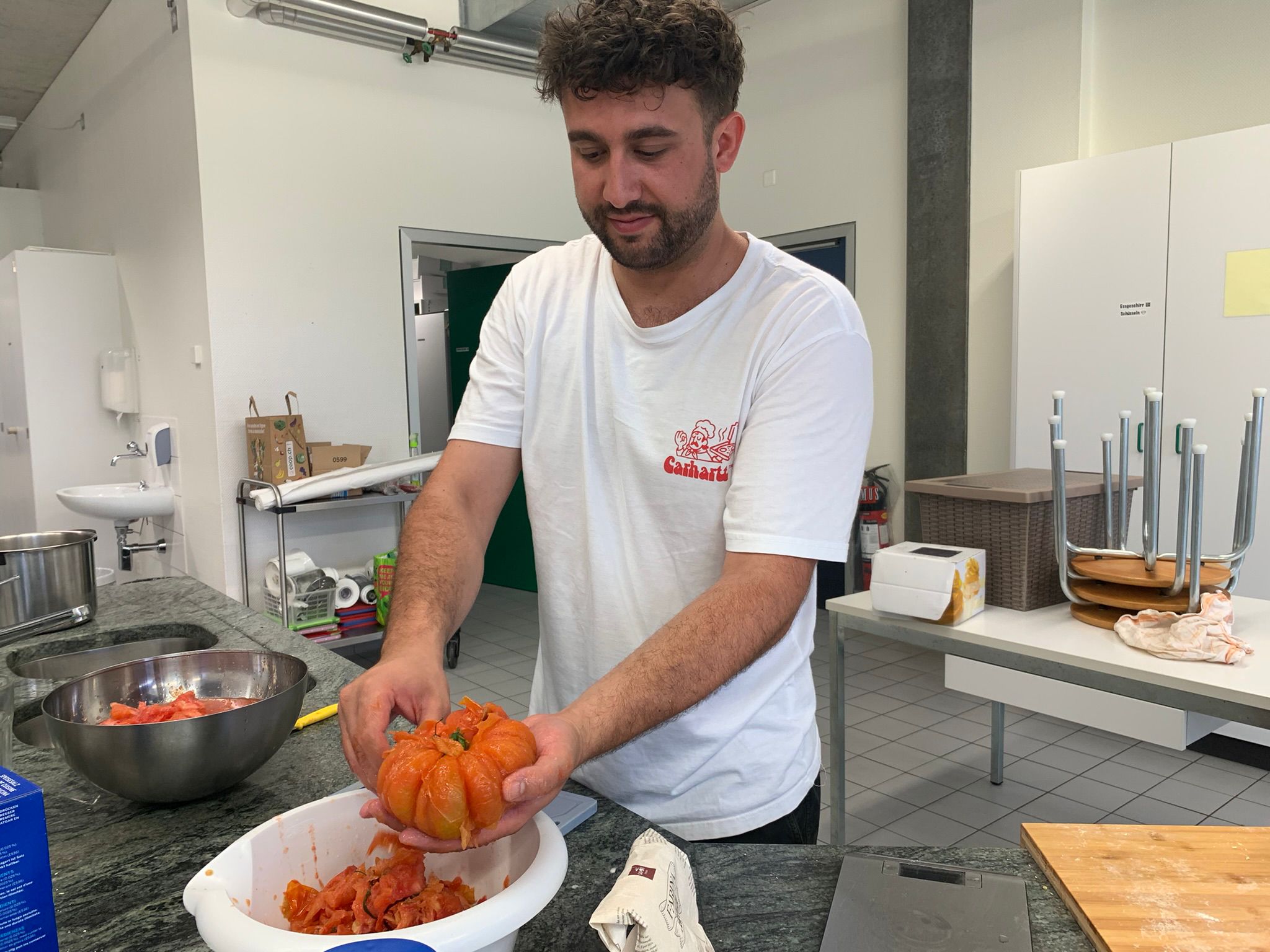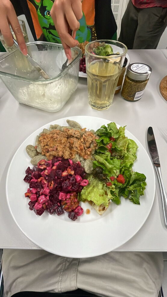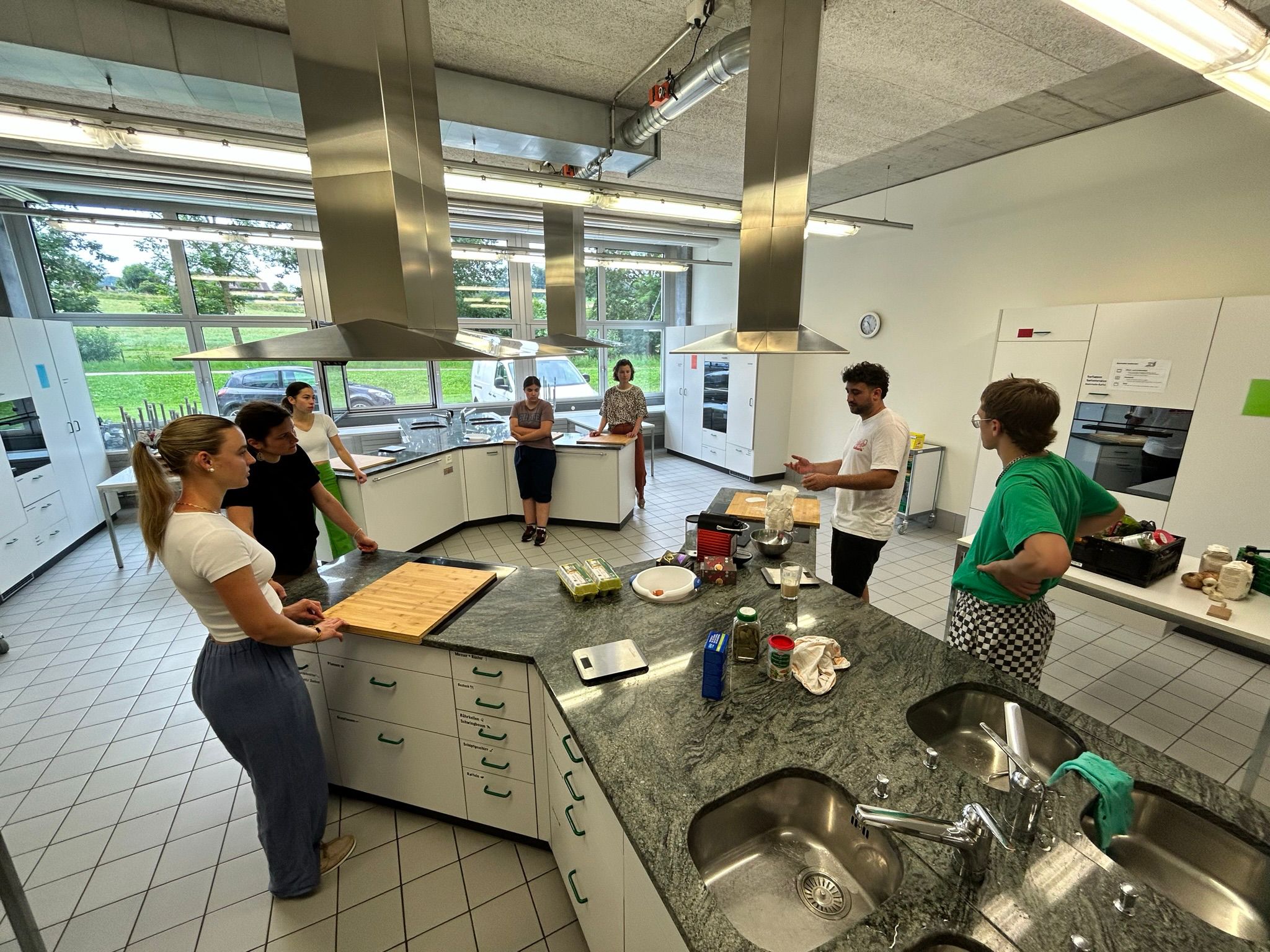 Der Nachmittag verbrachte die Gruppe in der Kochschule OSRM, wo unter anderem Gnogghi mit Brennnesseln zubereitet wurde. Das Gemüse und die Salate wurden bei der Familie Rentsch aus Murten bezogen. In den Workshops soll den Teilnehmern aufgezeigt werden, woher die Esswaren stammen, und es wird viel Wert gelegt auf gesunde, nachhaltige Produkte.