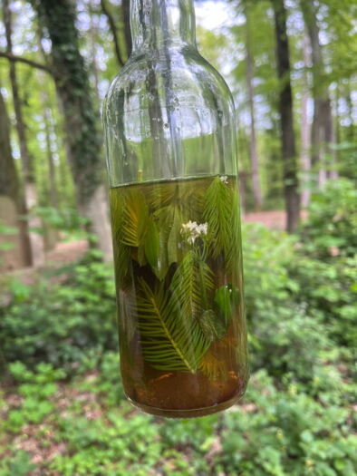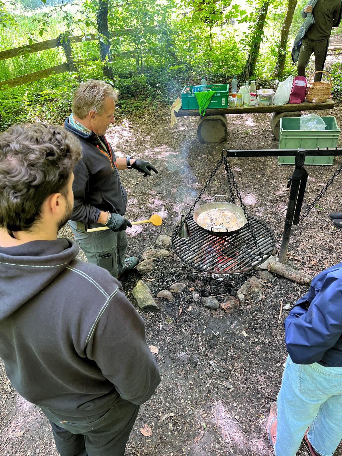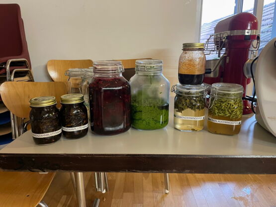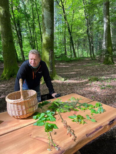 Der Workshop wurde in zwei Etappen aufgeteilt: am Vormittag erwartete der ehemalige Wildhüter Erwin Bürgi die Jungmannschaft bei der Galmhütte. Beim Wildhüter-Stützpunkt informierte Elmar über das richtige Verhalten im Wald, welche Pflanzen in einem Buchenwald und wo welche Pilze zu finden sind. Es wurde den Teilnehmern nahegelegt, den Wald so zu behandeln als wäre er ihr eigenes Wohnzimmer. «Learning by doing» in Form von Streifzügen durch das Gehölze: Pflanzen bestimmen, wie sie abgeschnitten werden und auf keinen Fall ausgerissen werden sollen. Gesammelt wurde Waldmeister, Goldnessel, Brennnesseln, Fichtensprossen, die anschliessend zu einem Oximel verarbeitet wurden, ein Shot fürs Immunsystem, der morgens auf nüchternen Magen eingenommen wird. Ein Oximel ist ein vitalisierender Sirup aus Honig und Essig, in den man Kräuter etc. beimischt.