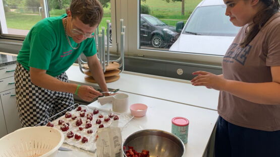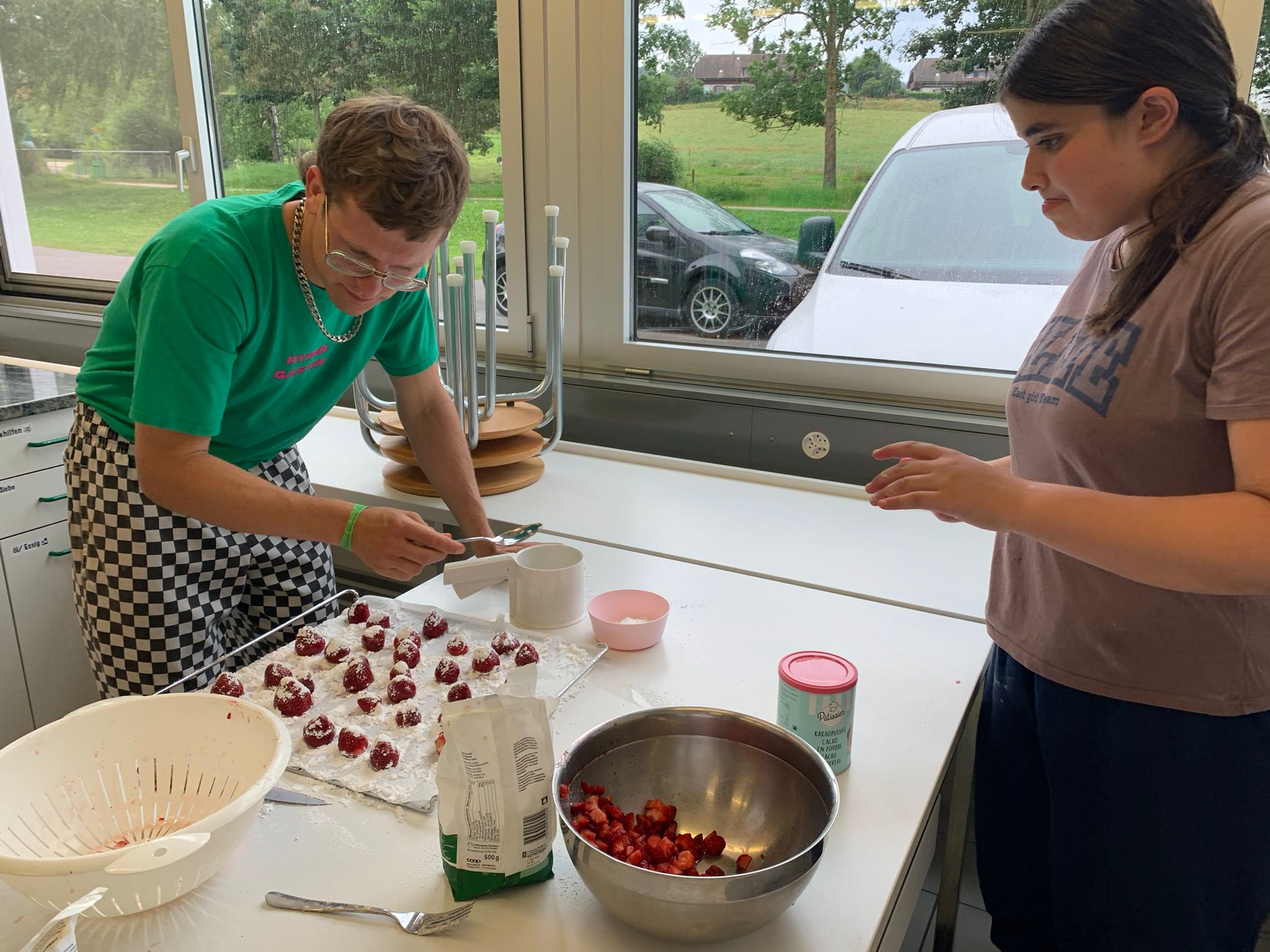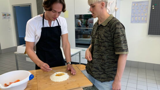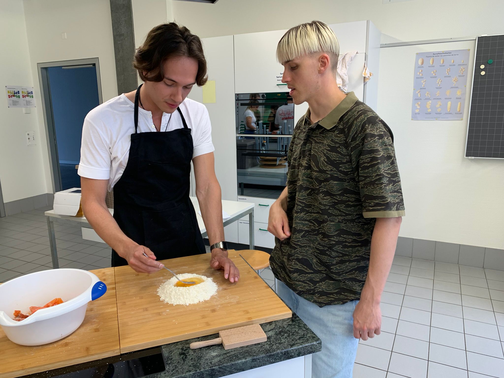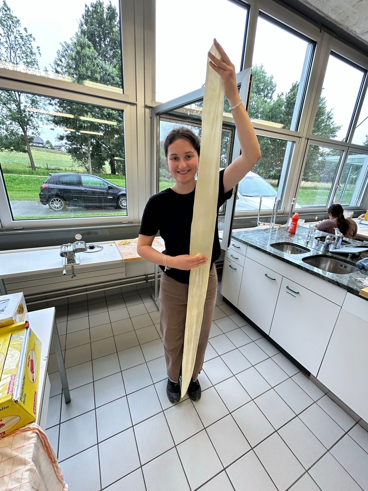 Der vierte Kulinarik Workshop stand ganz im Zeichen selbst hergestellter Teigwaren. Mauro Leuenberger, Kochschullehrer an der OSRM und Lukas Lauber, Mitorganisator des Kulinarik Projektes verstanden es, die jungen Menschen beim Herstellen der verschiedenen Pasta Teige anzuleiten. Ein Teig wurde sogar braun eingefärbt mit Kakaopulver und später mit einer Erdbeersauce serviert, sehr experimentell und mit ganz neuen Geschmackserlebnissen!