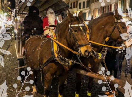 Am 6. Dezember von 18:00 bis 19:30 Uhr erwartet der Samichlous auch dieses Jahr Gross und Klein im Stedtli beim mittleren Brunnen. In Murten kommt der Samichlous aber nicht mit einem Esel, sondern stilvoll auf einem Pferdewagen daher.