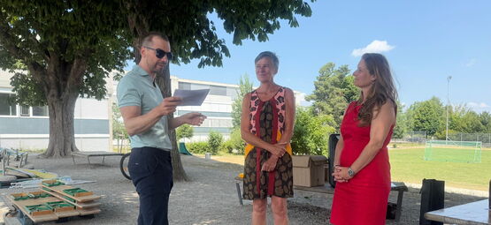 (Bildlegende: Schuldirektor Christian Mauron, Regula Hurni, und die stellvertretende Direktorin Judith Fasel-Meier)