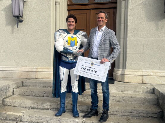 Bildlegende: Bionicman alias Michel Fornasier empfängt einen Scheck vom Präsidenten des Lion Club Murten, Adrian Riedo.