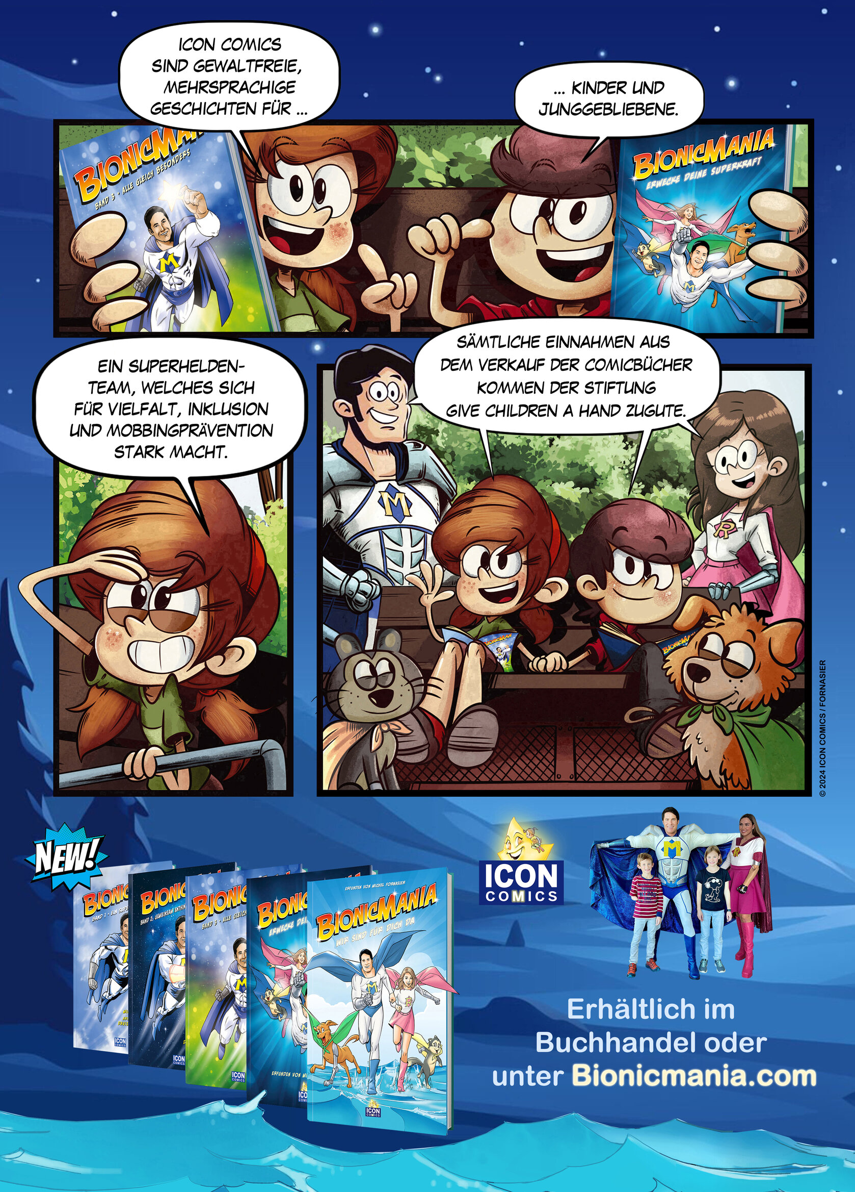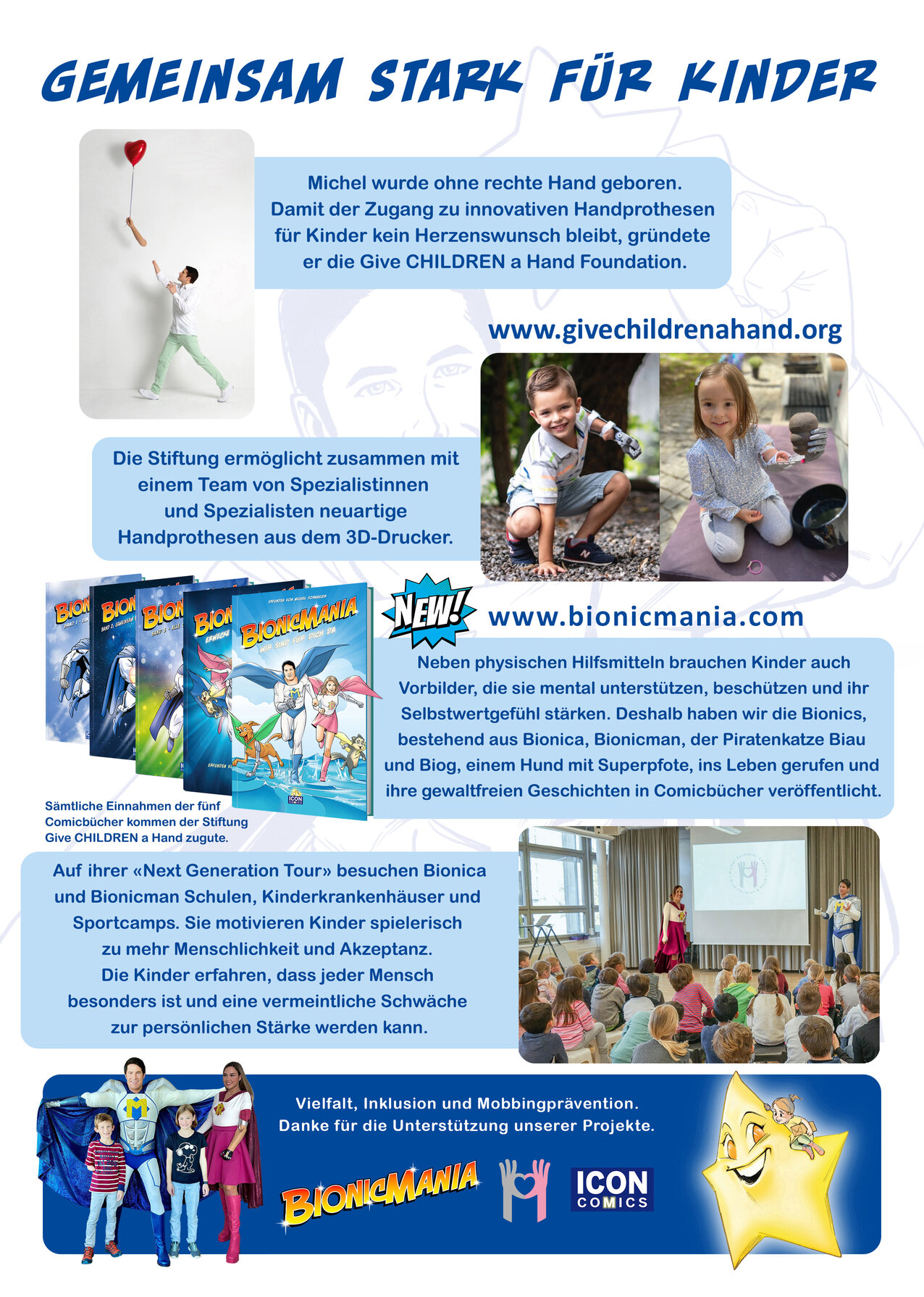 Michel Fornasier, in Düdingen aufgewachsen, hat schon früh Erfahrungen mit Mobbing sammeln müssen, bis er schliesslich seine Prothese erhalten hat. Aus dieser Erfahrung entwickelte Fornasier später gewaltfreie Comicbücher, in denen er als Superheld Bionicman gemeinsam mit der Superheldin Bionica für Menschen mit Besonderheiten stark macht. In den Bionicmania-Comics existieren die Helden nicht nur auf dem Papier: Der Hund Biog mit seiner Superpfote und die Piratenkatze Biau begleiten die Geschichten auch im echten Leben. So zeigen Michel und Gina Kindern, dass Mut, Freundschaft und Akzeptanz stärker sind als Ausgrenzung.