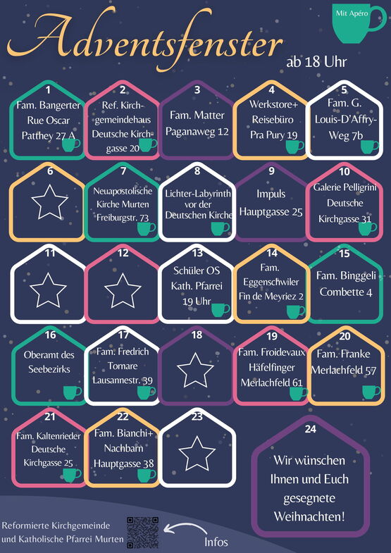 Die Reformierte Kirchgemeinde Murten und die Katholische Pfarrei Murten laden auch in diesem Jahr zu den beliebten Adventsfenstern ein. Die stimmungsvoll gestalteten Fenster bringen Licht in die dunkle Jahreszeit und schaffen Orte der Begegnung.