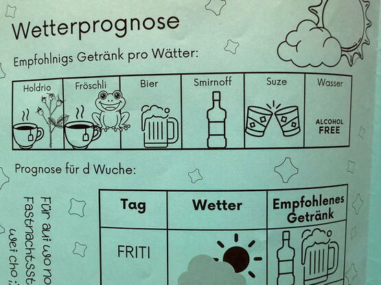 Selbstverständlich fehlt dieses Jahr die Wetterprognose für die vier respektive fünf närrischen Tage (fastnachtsdienstags mit eingeschlossen) nicht. Die scheinbar harmlosen Getränke, es sind dies Tees mit Namen Holdrio und Fröschli, wirken mehr, als man denkt – Insider wissen Bescheid!