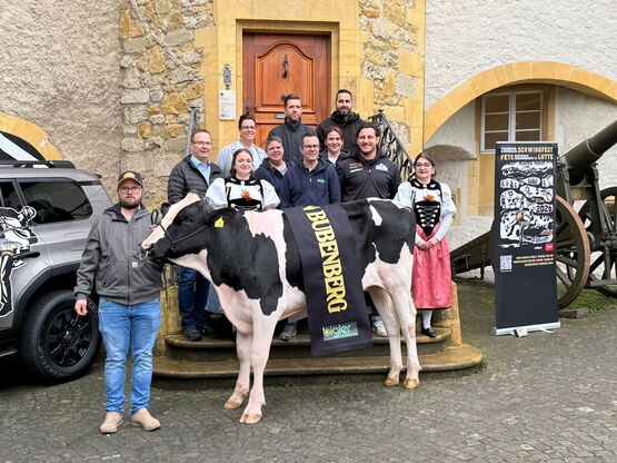 Bildlegende: Patrick Benninger, Landwirt in Jeuss und Züchter, Fredy Wolf, Vizepräsident OK, Richard Hurni, Medien & Marketing, Christoph Wieland, Präsident OK, Stefan Leuenberger, Vizepräsident OK, Lario Kramer, Eidgenosse und Taufpate, Ehrendame