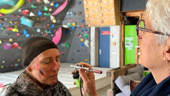 Ein Kompressor erzeugt Druckluft, die durch einen Schlauch zur Airbrush-Pistole geleitet wird. Im Inneren der Pistole wird die flüssige Farbe durch den Luftstrom zerstäubt und als extrem feiner Farbnebel ausgestossen. Da kein mechanischer Kontakt stattfindet, entsteht eine perfekt glatte, gleichmässige Oberfläche. Die Technik ist ideal für weiche Farbverläufe und Schattierungen. Man kann Farben lasierend (durchscheinend) übereinanderlegen, um Tiefe zu erzeugen. Vorteil von diesem Schminkverfahren: kein Schwitzen, kein Jucken und volle Bewegungsfreiheit beim Tanzen und Feiern.
