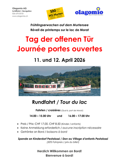 Am Samstag und Sonntag, 11. und 12. April 2026 kann das «MS Murten» ab 12.00 Uhr im idyllischen Hafen Murten (Quai 6) besichtigt werden. Es darf gefachsimpelt werden und alle Fragen rund um Charterfahrten auf den 3 Juraseen werden beantwortet. Sie werden staunen, was alles möglich ist!