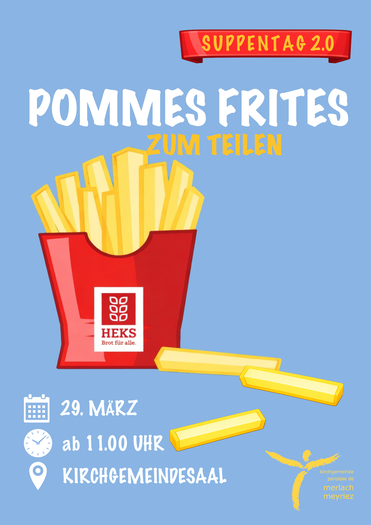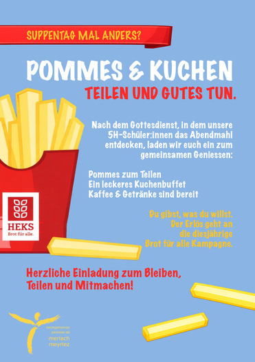 Direkt danach im Kirchgemeindesaal: Fastensuppe 2.0, wir teilen Pommes Frites. Dieses Jahr machen wir es unkompliziert und richtig gemütlich: Pommes Frites und ein Kuchenbuffet. Schnapp dir eine Portion, stell dich zu jemandem dazu oder setz dich an den Tisch. Bleib noch auf einen Schwatz und geniesse Gemeinschaft.