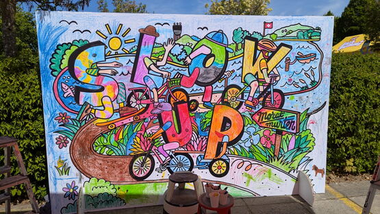 Ein besonderes Highlight bildete die künstlerische Intervention des Freiburger Künstlers Lowrider, der für seine urbanen und farbenfrohen Werke bekannt ist. Während des Events entstand vor Ort ein grossformatiges, rund 3 x 2 Meter grosses Wandgemälde, das vom Künstler vorbereitet wurde und von Kindern vor Ort ausgemalt werden konnte. So wurde das Jubiläum auf kreative und partizipative Weise erlebbar gemacht. Im Zentrum des Werks steht die Vielfalt der Teilnehmenden, die den slowUp Murtensee prägen und ihm seine besondere Atmosphäre verleihen. Dieser Gedanke diente als Inspiration für die künstlerische Umsetzung. Gleichzeitig nutzte der Künstler den Anlass auch selbst sportlich und legte als begeisterter Sportler einen Teil der Strecke joggend zurück, was ihn auch persönlich zu einem passenden Botschafter des slowUp macht. Das Werk greift die Vielfalt und Dynamik des slowUp Murtensee auf und bleibt als sichtbares Zeichen dieses besonderen Jubiläums bestehen.