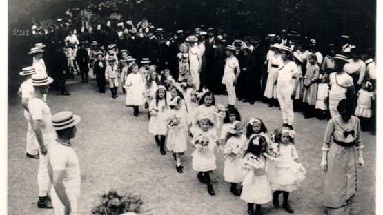 8 / 8BildergalerieMädchen in Spitzenkleidern, Buben in Matrosenanzügen und flotte Turner mit Kreissägen prägen neben den Kadetten um 1905 den Umzug.