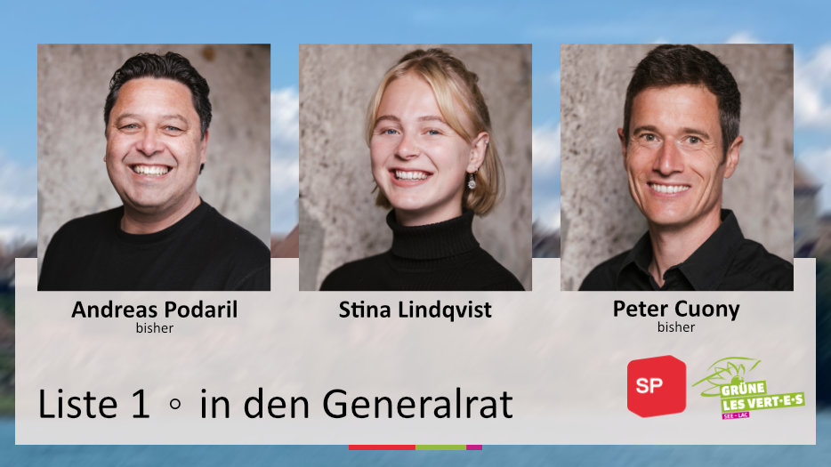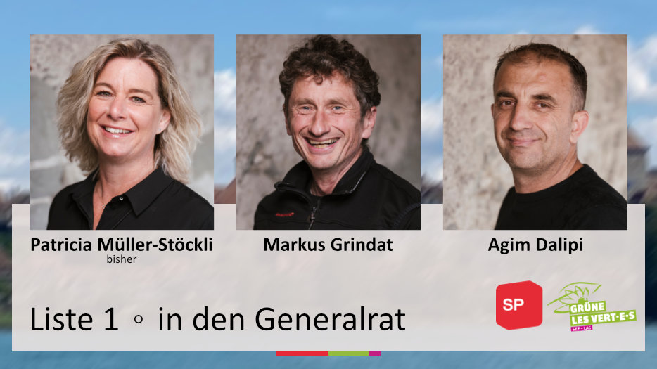 Als Kandidatinnen und Kandidaten für den Murtner Generalrat präsentiert die Gruppe der SP und Grünen eine vielfältige Liste von 29 Personen jeden Alters, unterschiedlicher Sprach-, Berufs- und Ortsteilherkunft. Alle engagieren sich für eine lösungsorientierte, nachhaltige und soziale Politik in der Gemeinde Murten. Tim Camp, der bisherige Generalrat Alain Schüttel, Maurus Herren, Line Wider, Stina Lindqvist und Lara Schroeter stellen die sechs jüngsten Kandidatinnen und Kandidaten der Liste dar. Es folgen die bisherigen Generalrätin Julia Senti, Julien Authier, Daniel Brügger, die bisherigen Generalräte Pascal Känzig und Peter Cuony, Ronny von Siebenthal, Glenda Guillaume-Gentil, Berni Wieland, Brigitte Zehnder (bisher), Agim Dalipi, Reto Burger (bisher) und Patricia Müller-Stöckli (bisher), welche die Bevölkerung im Alter zwischen dreissig und fünfzig repräsentieren. Wertvolle Lebens- und politische Erfahrung von mehr als fünfzig Jahren bringen der bisherige Gemeinderat Alexander Schroeter, der bisherige Generalrat Andreas Podaril, Thomas Reiser, Patrick Morier, Michel Huber, Markus Grindat, Gerry und Catherine Gartmann aus Jeuss, die aktive Regionautin Kathrin Aebi-Bender, Doris Aeberhard und der bisherige Generalrat, ehemalige Generalratspräsident und aktuelle Fraktionspräsident Carl-Heinz «Kalle» Camp in die rot-grüne Liste ein.