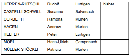 Es freut uns ebenfalls, eine kompetente und komplette 7er Gemeinderatsliste präsentieren zu können. Es treten an: Der bisherige Gemeinderat Rudolf Herren-Rutschi sowie die Generalrätinnen Susanne Castelli-Schwill und Patricia Müller-Stöckli sowie die Generalräte Peter Helfer und Hans Ulrich Möri. Weiter stellen sich Ramona Corbetti sowie Andrew Hagen zur Wahl. Da kommt einiges an politischer Erfahrung und frischem Elan zusammen.