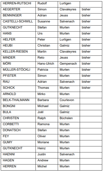 Für den Generalrat Murten wurden unsere Bisherigen nominiert: Simon Aegerter, Adrian Benninger, Susanne Castelli-Schwill, Stefan Gutknecht, Urs Hans, Peter Helfer, Christian Heubi, Martin Keller-Riesen, Reto Minder, Hans-Ulrich Möri, Patricia Müller-Stöckli, Simon Pfister, Adrian Rau sowie unser Fraktionschef Thomas Schick. Leider wird Adrian Kramer nach 13 Jahren Amtszeit unseren Generalrat verlassen. Weiter stellen sich fünfzehn Personen zum zweiten Mal und zwanzig Neue zur Verfügung, um in unserem Gemeindeparlament mitwirken zu dürfen.