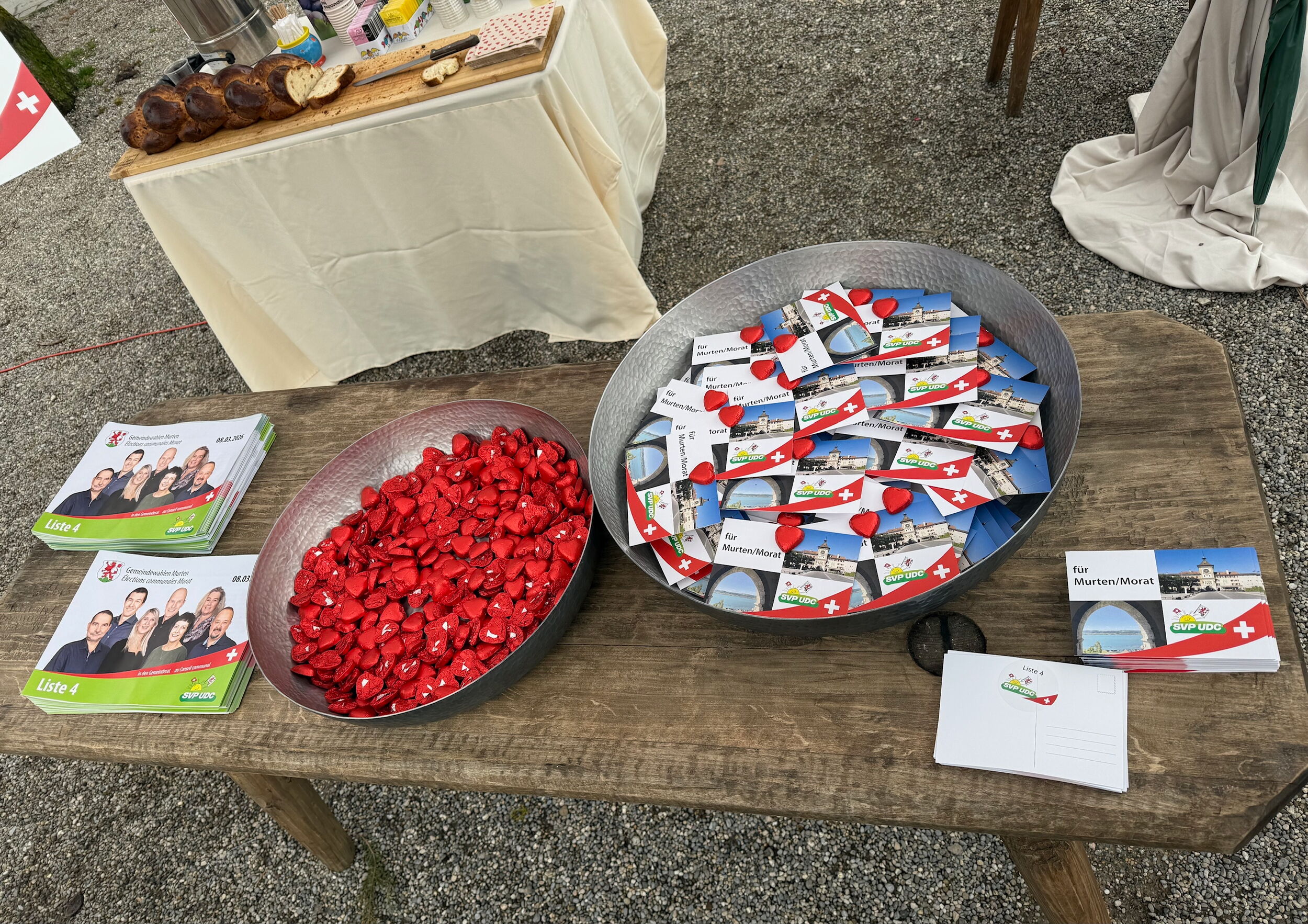 Passantinnen und Passanten nutzten die Gelegenheit, mit den Kandidierenden der Listen Nr. 4 persönlich ins Gespräch zu kommen und sich über die politischen Schwerpunkte der Partei zu informieren. Die am Valentinstag verteilten Postkarten mit Schokoladeherzen kamen besonders gut an.