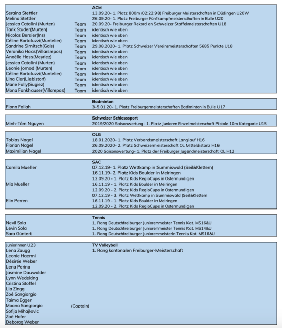 Vom ACM wurden Seraina und Melina Stettler geehrt. Seraina konnte im September 2020 den 800 Meter-Lauf an den Freiburger Meisterschaften in Düdingen für sich entscheiden. Melina holte im September 2020 bei den Fünfkampfmeisterschaften in Bulle den ersten Platz. Ebenfalls geehrt wurden zwei Teams vom ACM: Einerseits ein vierköpfiges Team, das einen Freiburger Rekord an den Schweizer Staffelmeisterschaften erzielen konnte und andererseits ein Team aus neun Sportler*innen, welches sich den ersten Platz bei den Schweizer Vereinsmeisterschaften erkämpfte.