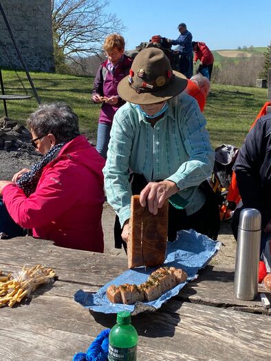 Erfrischt ging es dem Ruisseau des Vaux entlang bis zum kurzen, aber heftigen Aufstieg zum Tour St. Martin. Die Besteigung des Turmes dankte mit einer wunderbaren Aussicht. Ein Feuer wurde entfacht mit Anzündholz, das der «Sherpa» Martin mitgeschleppt hatte. Weisswein und Grissini eröffneten das Mittagessen. Es wurde grilliert und Orangensalat mit Minibananen garniert herumgereicht.