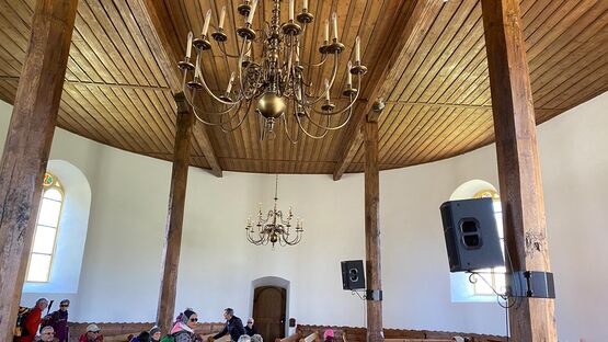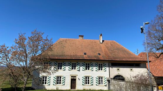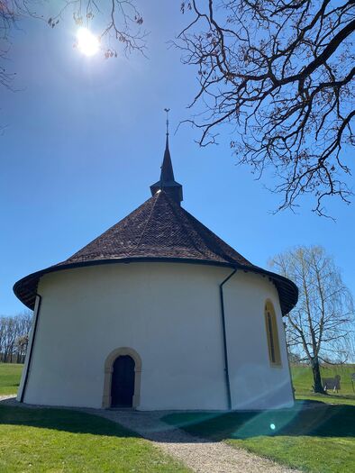 Anschliessend spazierten wir zur Rundkirche, deren Form auf einen Baustreit zwischen Zimmermann und Maurer zurückzuführen sei. In dieser Kirche wurde gesungen, was einige sehr berührte. Die grün-weiss gestrichenen Fensterläden des Pfarrhauses seien typisch im reformierten Kanton Waadt.