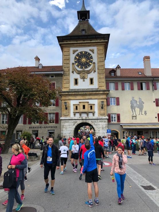 Kilometer 15: Vorbei am Eishockeystadion von Fribourg Gotteron, bleiben noch zwei Kilometer. Die Kathedrale ist bereits erkennbar, wo bis 1977 unmittelbar daneben, bei der berühmten Murtenlinde, das Ziel war.
