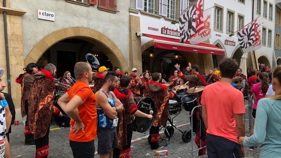 Kilometer 4: Die Guggenmusigg am Strassenrand sowie der DJ mit seinen mitgebrachten Boxen geben alles und treiben die Läuferinnen und Läufer mit den (hard-) rockigen Klängen den Berg hoch.