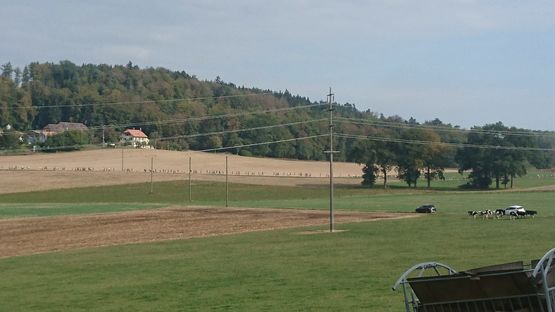 Kilometer 6: Ein willkommener Schluck Wasser und dann geht es endlich wieder mal ein bisschen abwärts, doch über das offene Gelände von Wallenried ist in der Ferne bereits der nächste Aufstieg hinauf nach Courtepin zu erkennen.