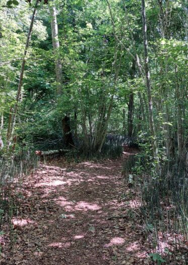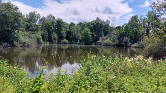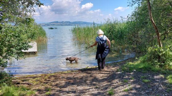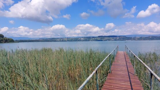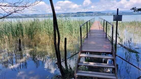 Unsere Wanderung beginnt in Faoug beim Restaurant Werft, das bekannt ist für seine gute Küche und den wunderbaren Blick auf den Murtensee. Richtung Westen verläuft ein gemütlicher, Rollstuhl- und Kinderwagen-freundlicher Weg. Wir wechseln aber schon bald Richtung See ins Dickicht, weil wir das Jumanji-Feeling nicht verpassen wollen. Kleine Wege führen quer durch den Wald und zeigen uns eine spannende, ursprüngliche Waldlandschaft. Mit dem Vogelgezwitscher, Entengeschnatter und dem leisen Säuseln des Windes durch die Blätter der Bäume können wir richtig entschleunigen.