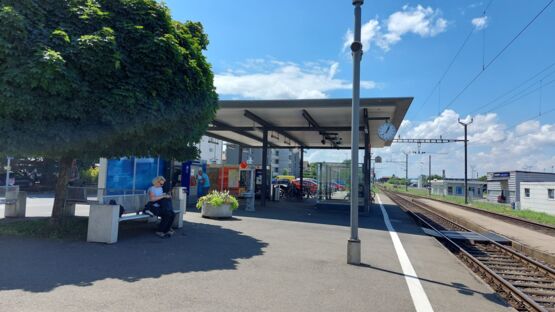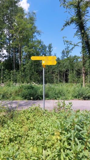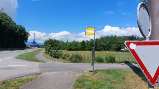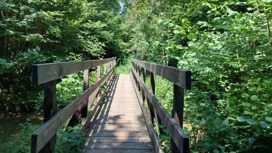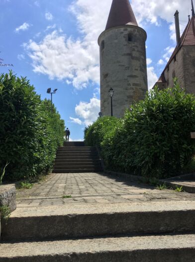 Nach dem Camping Avenches – Port – Plage folgen wir kurz einem Asphaltweg in südwestlicher Richtung, bis wir an die Hauptstrasse gelangen. Wir überqueren diese und vor unseren Augen tut sich eine wunderbare Naturlandschaft auf. Es ist dies der renaturierte Bachlauf des Eau Noire (Schwarzes Wasser). Dem folgen wir bis zu den Wiesen und Feldern unterhalb des historischen Städtchens Avenches. Ein kurzes Stück geht es jetzt durch das Industriegebiet, bis zum Bahnhof. Dort folgen wir dem Wegweiser, der uns hinauf zum Amphitheater führt.