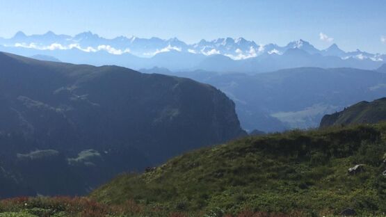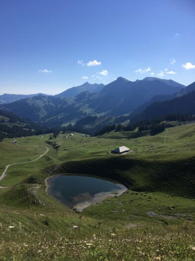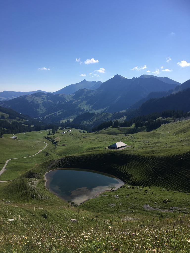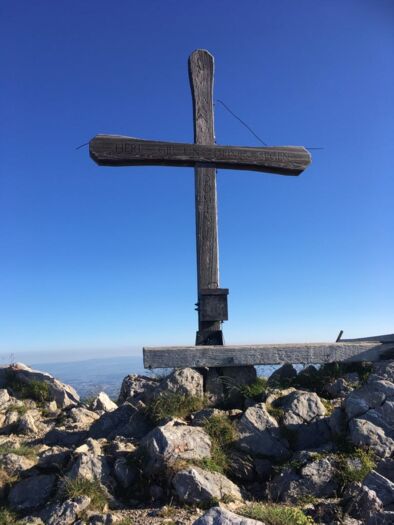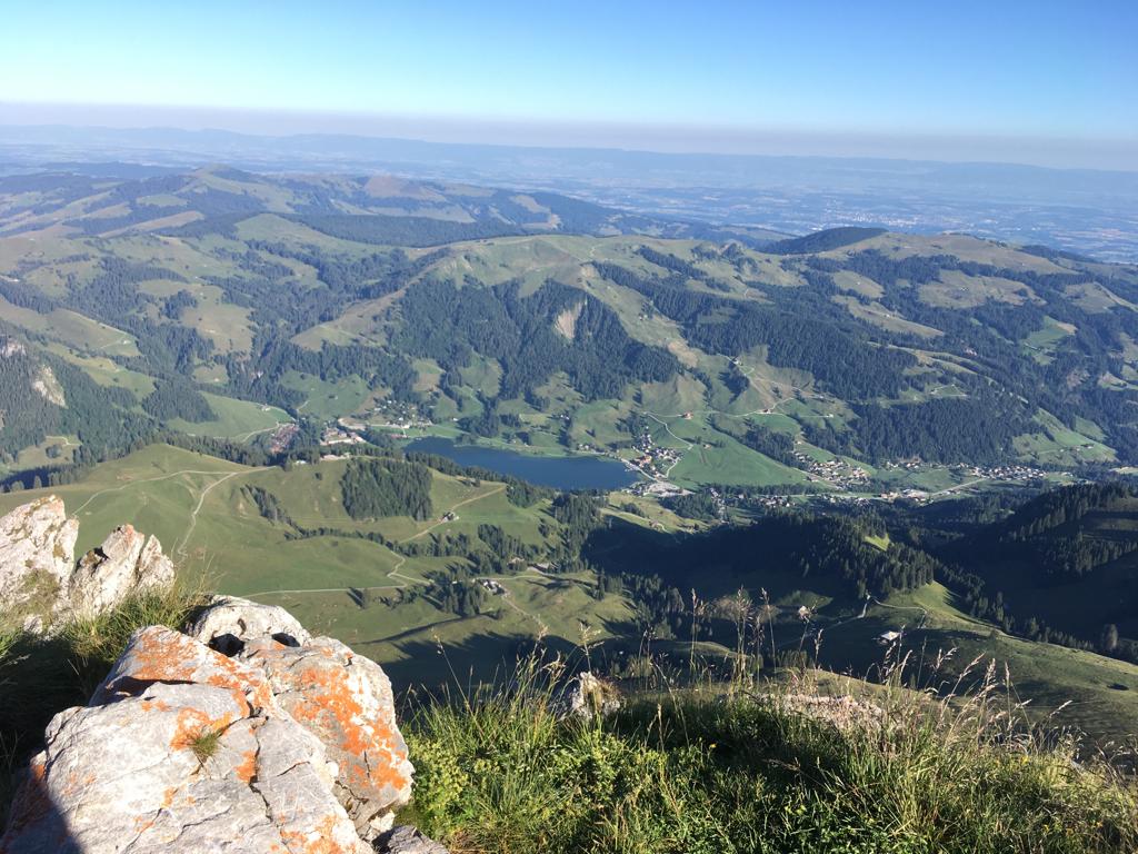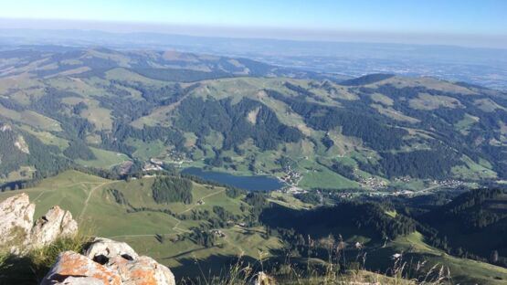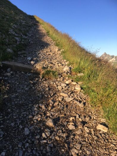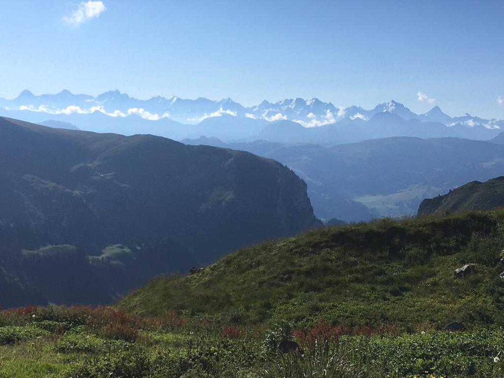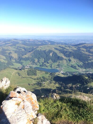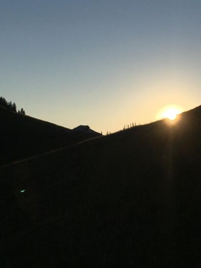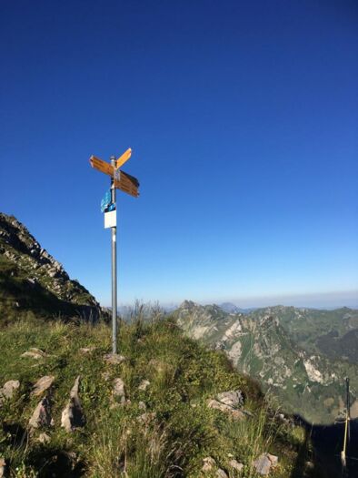Stetig geht es bergauf. Ich begegne einer Taferser Abschlussklasse, die noch verrückter ist als ich und den Sonnenaufgang auf dem Gipfel erlebte. Chapeau! Auf sie wartet nun ein Fondue. Vor uns läuft einige Zeit eine Ringdrossel, als wollte sie uns zeigen, wie leichtfüssig man diesen Steilhang raufhüpfen kann. Ich hüpfe etwas weniger als mein Hund und die Drossel. Auf der Passhöhe erwartet uns eine Gruppe Schafe. Und eine grandiose Aussicht ins Simmental und in die Berner Alpen. Weiter steigen wir die nächsten zwanzig Minuten zum Gipfelkreuz. Wunderbar ist es hier oben und wir gönnen uns eine längere Pause mit einem morgendlichen Picknick.