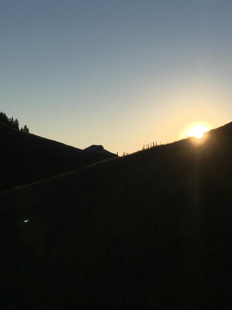 Von der Kirche aus steigen wir aufwärts. Die Morgendämmerung hat eingesetzt, die Vögel fangen an zu pfeifen, der Riggisalpbach plätschert. In der Ferne hören wir die Kuhglocken. Es wird heller und wir sehen die Blumen am Wegrand. Beim Wegweiser wählen wir den linken Pfad, der in die Salzmatt führt. Über saftige Naturweiden geht es aufwärts. Und plötzlich ist sie da, die Sonne. Zuerst berührt sie die Bergspitzen und wagt sich immer weiter ins Tal, bis die ganze Landschaft golden glänzt. Es hat sich gelohnt, das frühe Aufstehen. Weiter wandern wir an einer blumengeschmückten Alphütte vorbei, bis zur Salzmatt. Von dort führt nur ein Weg auf die Kaiseregg. Ich sehe das Gipfelkreuz in weiter Entfernung.