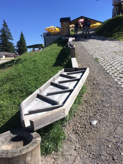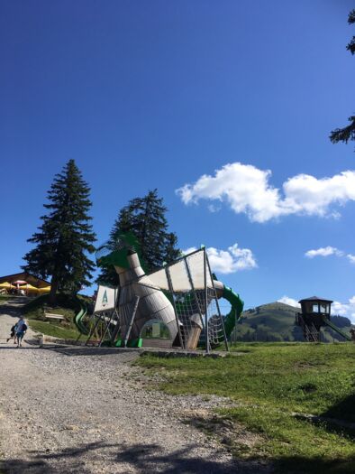 Die Wanderung auf die Riggisalp beginnen wir bei der Kirche in Schwarzsee. Zuerst wandern wir steil bergauf, dem Riggisalpbach entlang. Beim Wegweiser wählen wir die rechte Abzweigung, die zum Berggasthaus Riggisalp führt. Vor der Schaukäserei biegen wir rechts ab und erreichen kurz darauf den Spielplatz «Drachenland Kaiseregg». Hui, wie das zu und her geht. Die Kinder klettern, rutschen und schaukeln. Wippdrachen, Sandkasten, Kegelbahn, Balancierstege und die Rutschbahn lassen die Kinderherzen höher schlagen. Für müde Eltern und Grosseltern laden die Relax-Liegen und die Hollywoodschaukel zum Ausruhen ein.