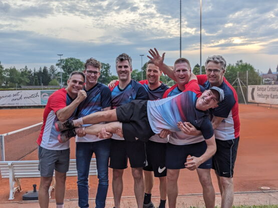 Gleichzeitig konnte auch das Herrenteam 35+ 2. Liga des TC Murten am Gerbeweg den Aufstieg in die 1. Liga 35+ feiern. Nach einem 2:4 Rückstand nach den Einzeln gegen Muri-Gümligen konnten alle Doppel gewonnen werden, was zu einem 5:4 Sieg führte. Dies bedeutete den Aufstieg der Murtener Herren in die 1. Liga. Ein erstaunlicher Comeback-Sieg, der die Moral und den Geist dieser Mannschaft zeigt.