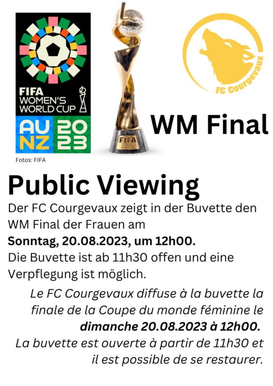 Wer möchte im Kreise von Gleichgesinnten beim WM Final der Frauen mitfiebern? Der FC Courgevaux zeigt in der Buvette den WM Final der Frauen am Sonntag, den 20. August um 12 Uhr. Ab 11:30 Uhr ist die Buvette geöffnet.