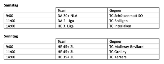 Am Wochenende des 14. und 15. Juni 2025 finden die folgenden Partien am Gerbeweg statt. Hervorzuheben ist das Halbfinale der Damen 30+ am Samstag um 9 Uhr.