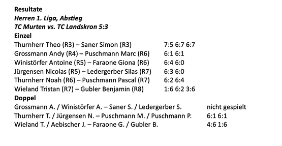 Da für das Wochenende vom 14. und 15. Juni 2025 sieben Heimspiele des Tennisclubs Murten in der 4. Runde angesetzt waren, wurde die Begegnung der Herren 1. Liga gegen den TC Landskron auf den 7. Juni 2025 vorverlegt. Die Murtner Mannschaft um Captain Jonas Aebischer konnte ihrer Favoritenrolle gerecht werden und sicherte sich den Klassenerhalt