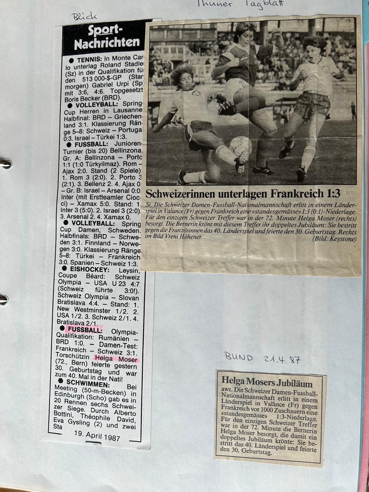 Rechtzeitig zum Auftakt der Europameisterschaft gedenkt die Altstadtbuchhandlung Murten der Murtner Fussballpionierin Helga Moser. Mit 15 Jahren begann sie ihre Fussballkarriere beim DFC Bern. Bereits vier Jahre später folgte das erste Länderspiel für die Schweiz gegen Holland. Helga Moser erzielte in insgesamt 40 Länderspielen sieben Tore, ihr erstes am 27. Mai 1981 in Finnland.