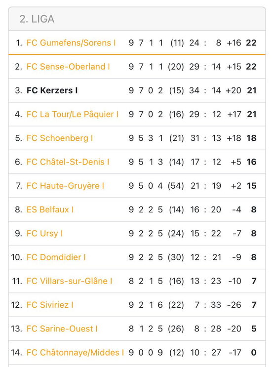 Sense Oberland konnte nicht mehr reagieren, während Kerzers mit einer sehr soliden Verteidigung und einem stark spielenden Mittelfeld dagegenhielt. Nach dem Schlusspfiff stand Kerzers als verdienter Derbysieger da und schloss zur Tabellenspitze auf. Da der zweite Tabellenführer Gumefens/Sorens ebenfalls verloren hat, beträgt der Rückstand auf das Tabellenführerduo nur noch einen Punkt.