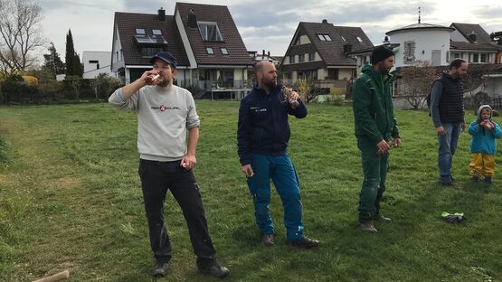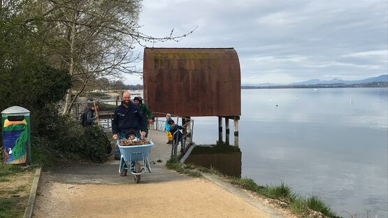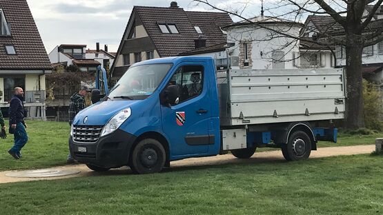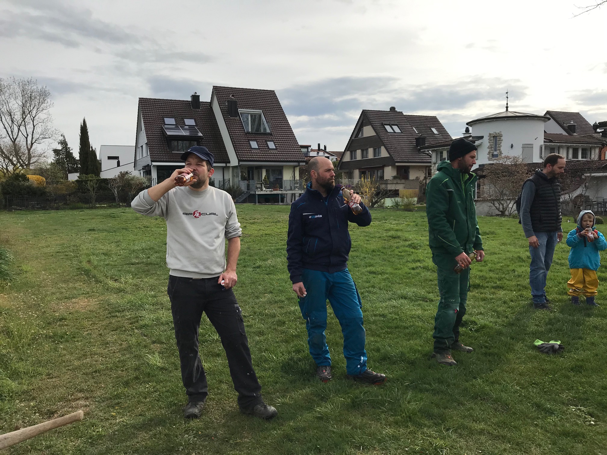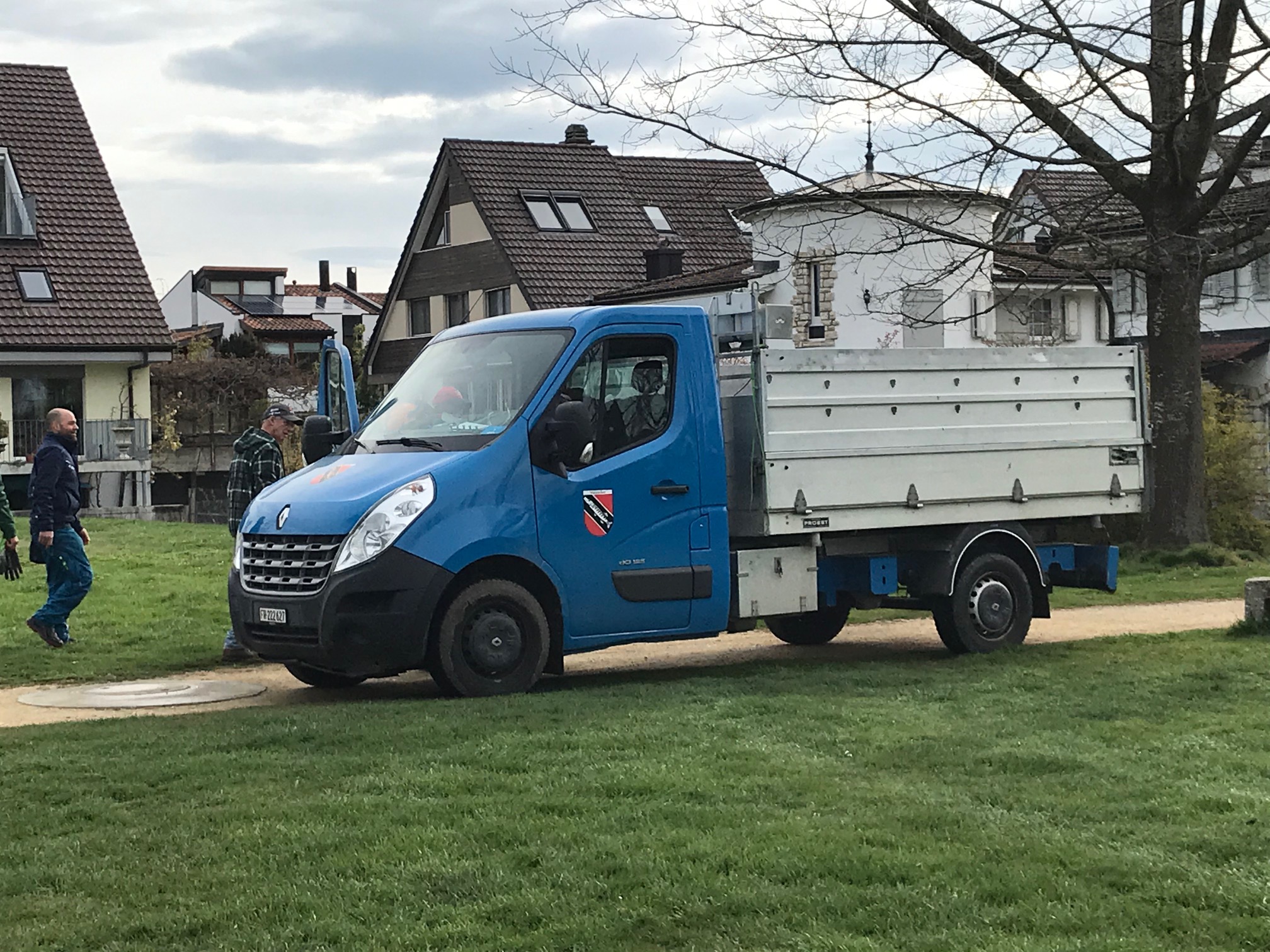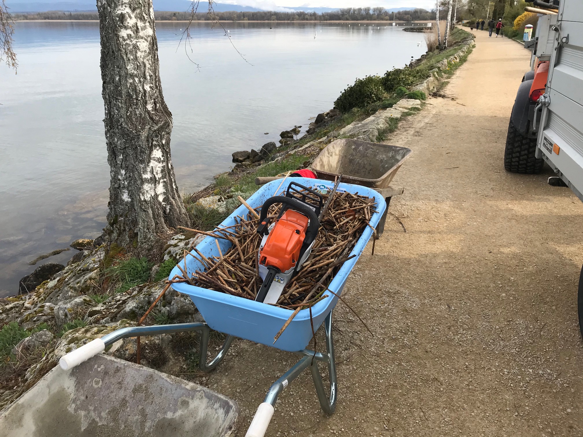 Gegen 9:30 Uhr traf ich nicht unweit der La Cabane auf eine Gruppe, die sich nach dem morgendlichen Einsatz gemeinsam mit den Werkhofmitarbeitern eine kleine Pause gönnte. Die Schubkarren waren voll, die Werkhof-Kleintransporter waren gerade von einem Abtransport zurückgekehrt.